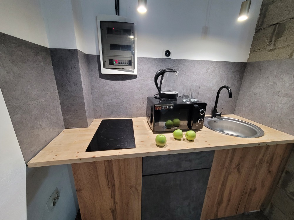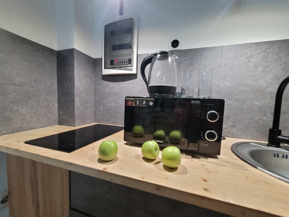 Есть все необходимое для проживания: ТВ smart tv, wi-fi, микроволновка, электрочайник, холодильник, варочная плита 2 комфорки, сплит система, стиральная машина, качественное постельное белье, комплект полотенец, 2 подушки, посуда в полной комплектации, утюг + гладильная доска, средства гигиены, моющие средства.