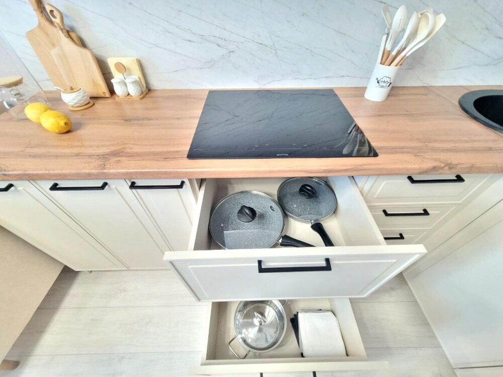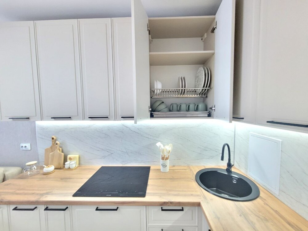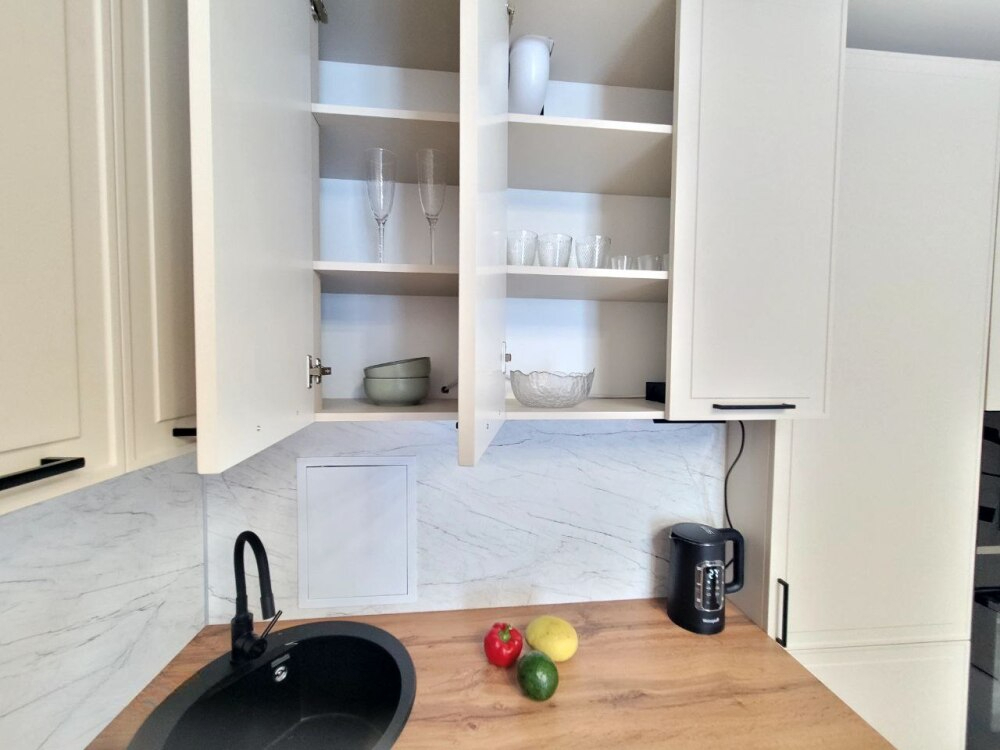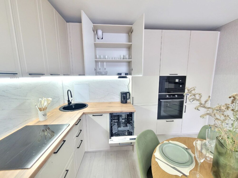 Кухня: Полностью оборудованная кухня с плитой, духовкой, микроволновой печью, посудомоечной машиной, холодильником и всей необходимой посудой и приборами для самостоятельного приготовления блюд.