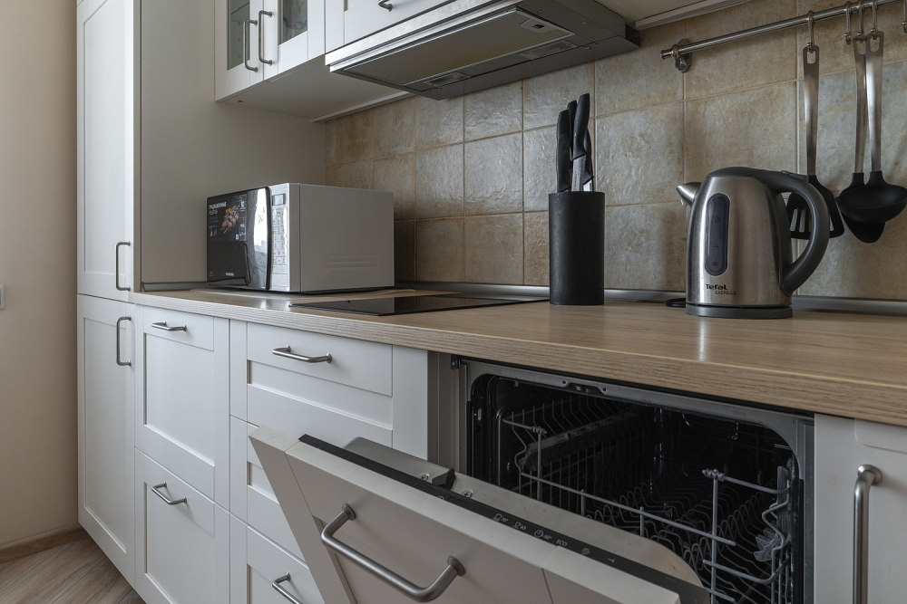 Техника: кондиционер, стиральная и посудомоечная машины, микроволновая печь, духовка в виде мини-печи, холодильник, электрочайник.