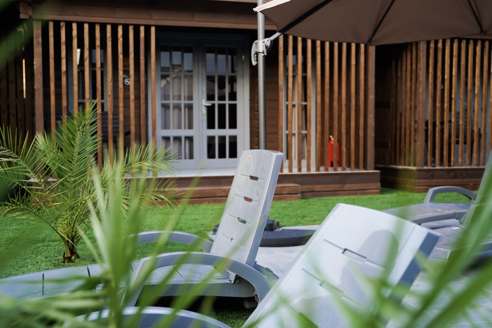 Зона отдыха с регулируемыми шезлонгами и зонтиками - расслабьтесь под тёплыми лучами солнца.