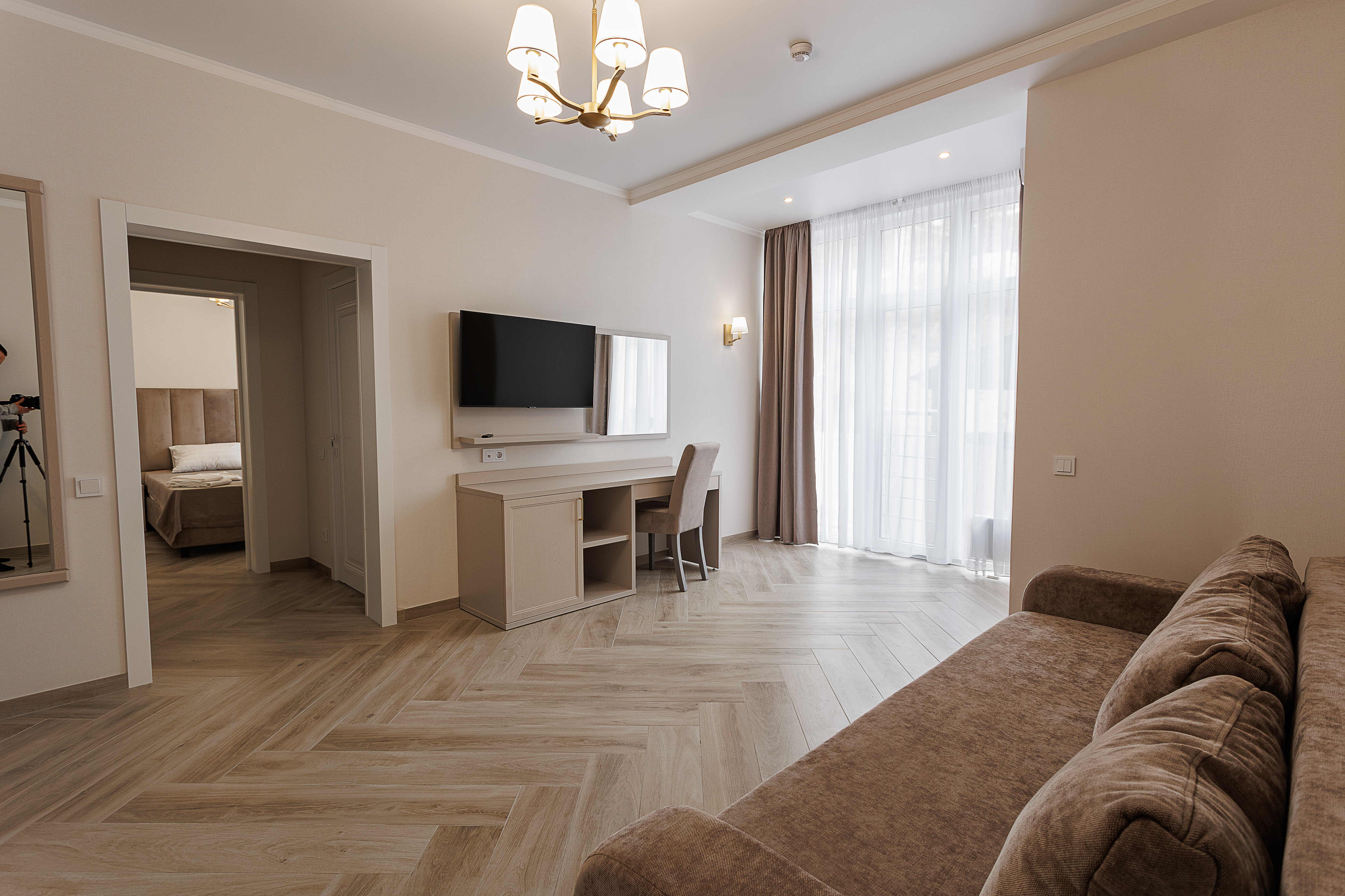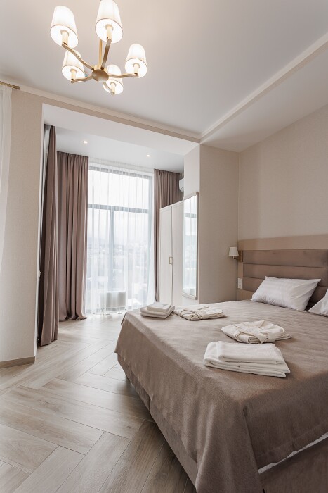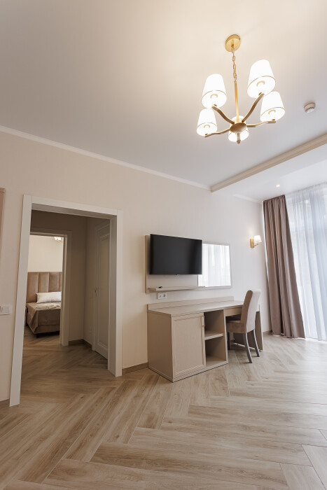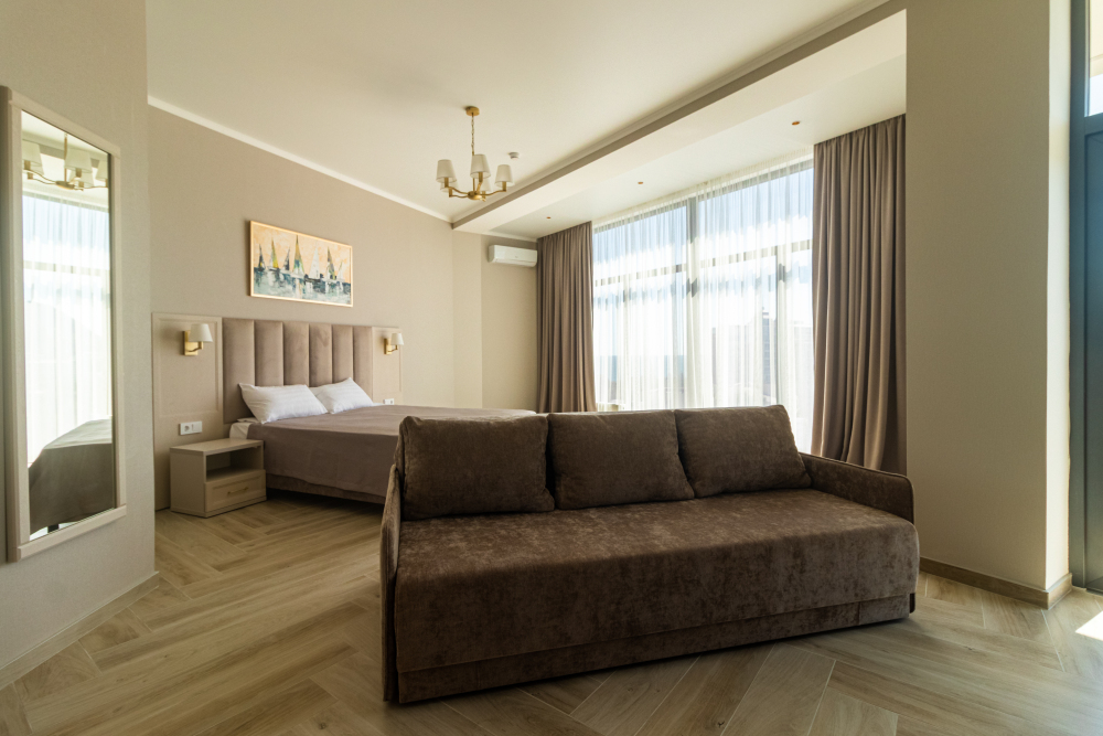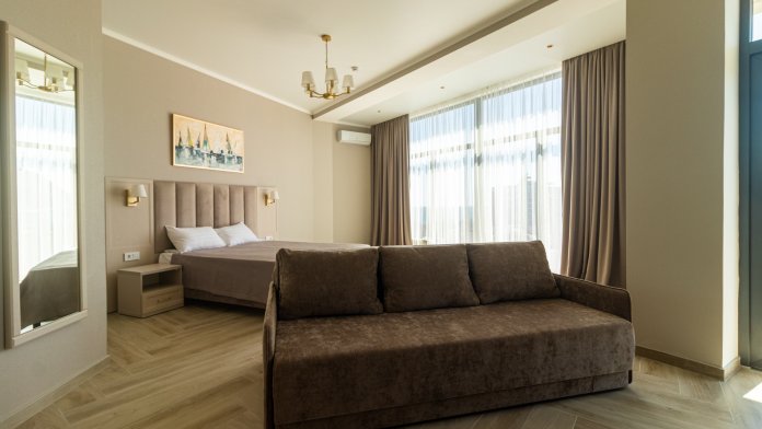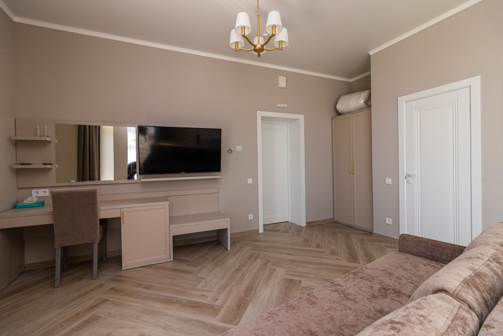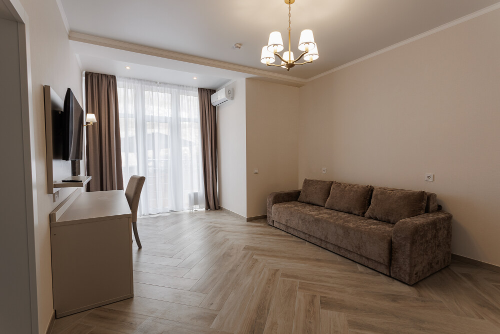 В номере: большая двуспальная кровать, гостиная зона с мягкой мебелью, современная техника: Smart TV, кофемашина, усиленная звукоизоляция, ванная комната с качественными принадлежностями.