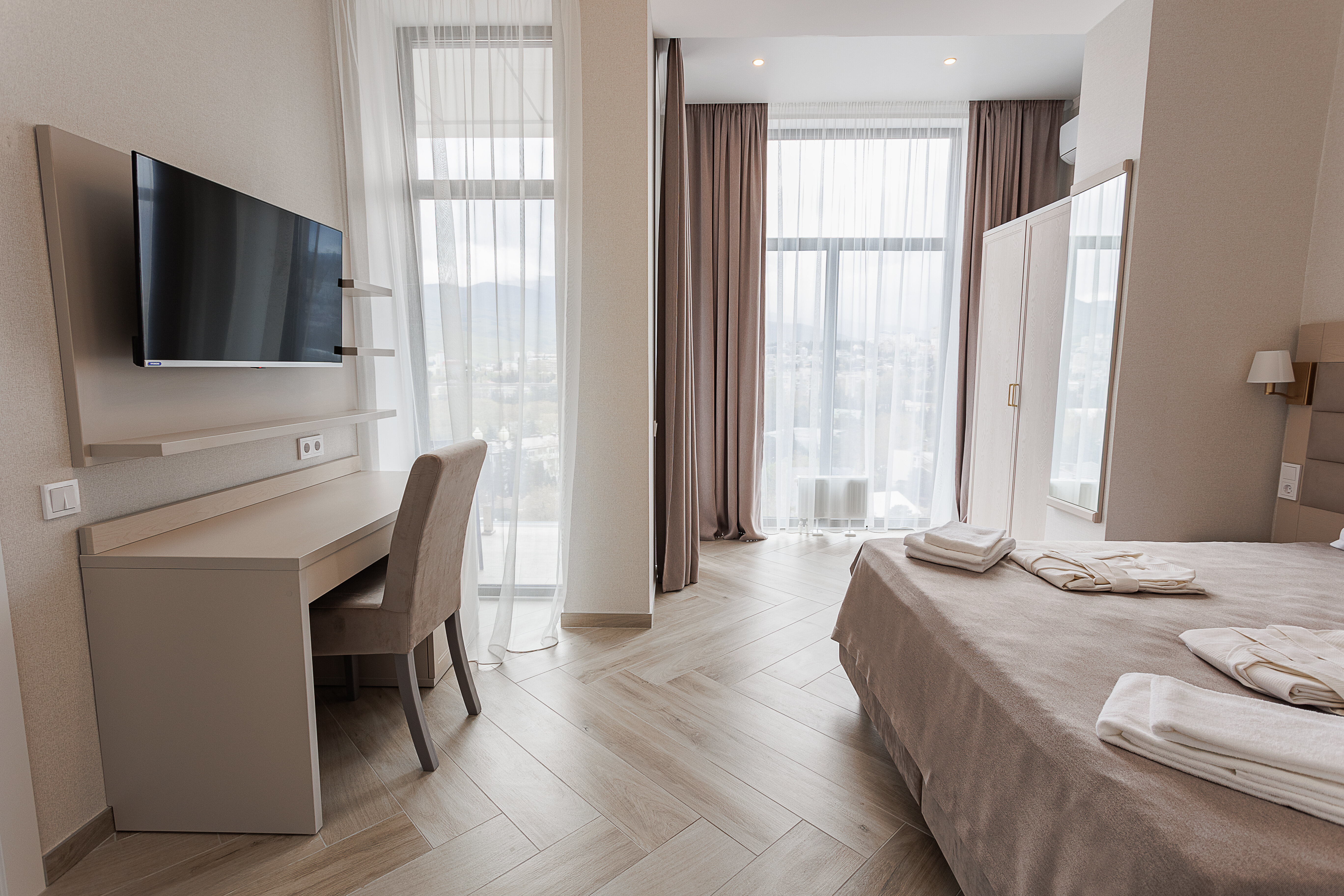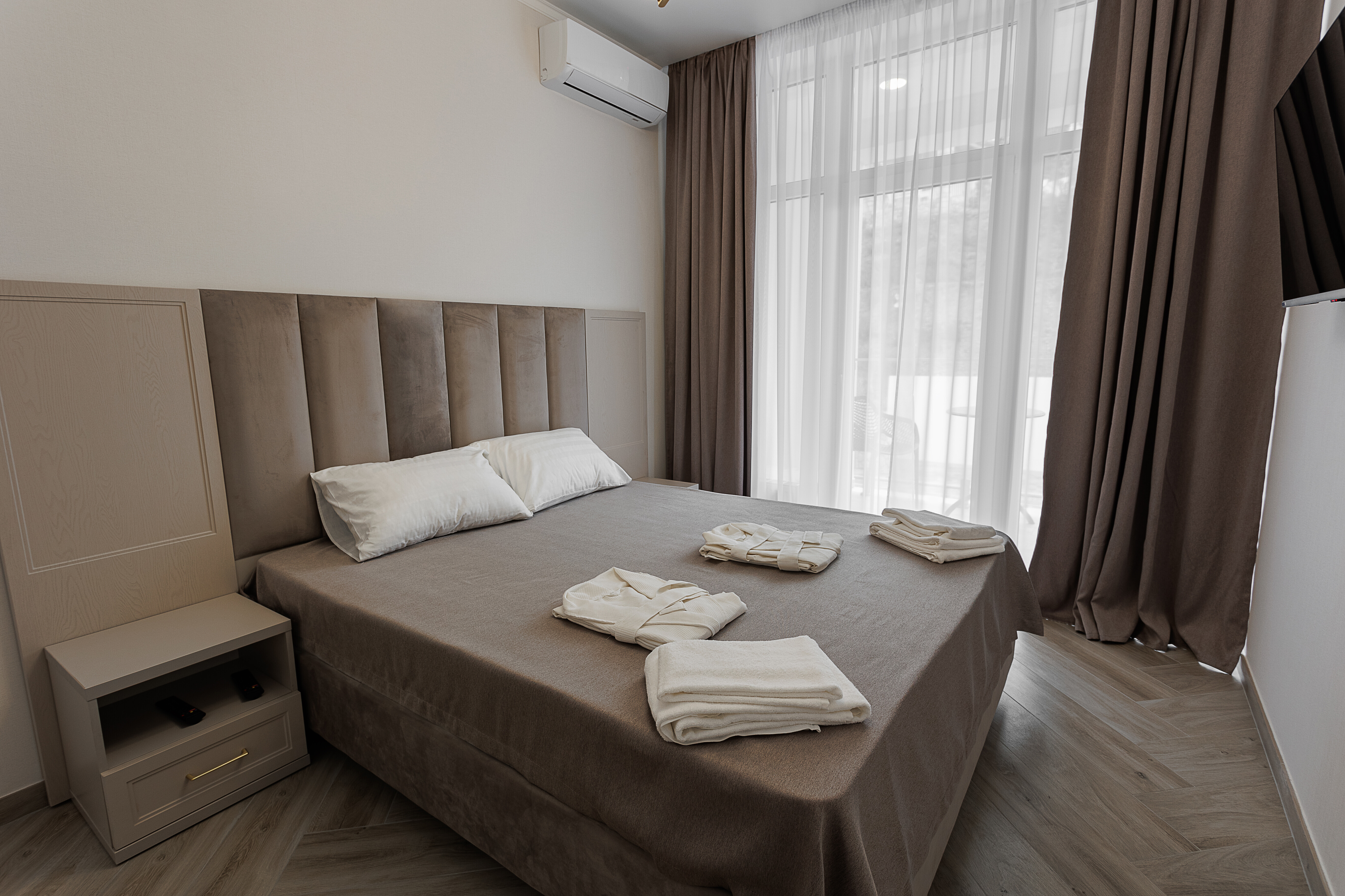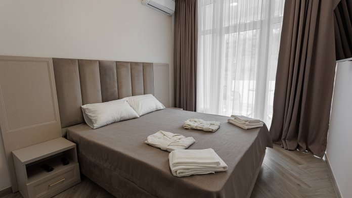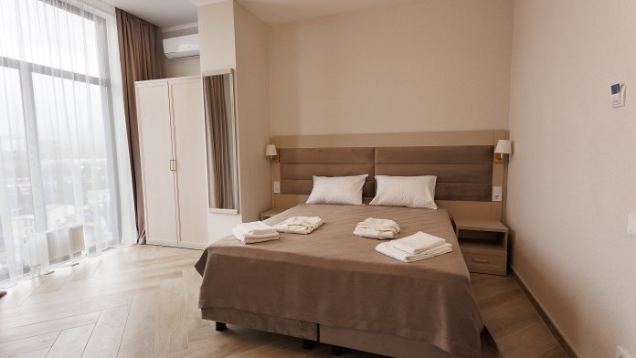 В номере: Удобная двуспальная кровать (160×200 см), рабочая зона с письменным столом, современная техника: кондиционер, Smart TV, мини-холодильник и чайный уголок, собственная ванная комната, Wi-Fi