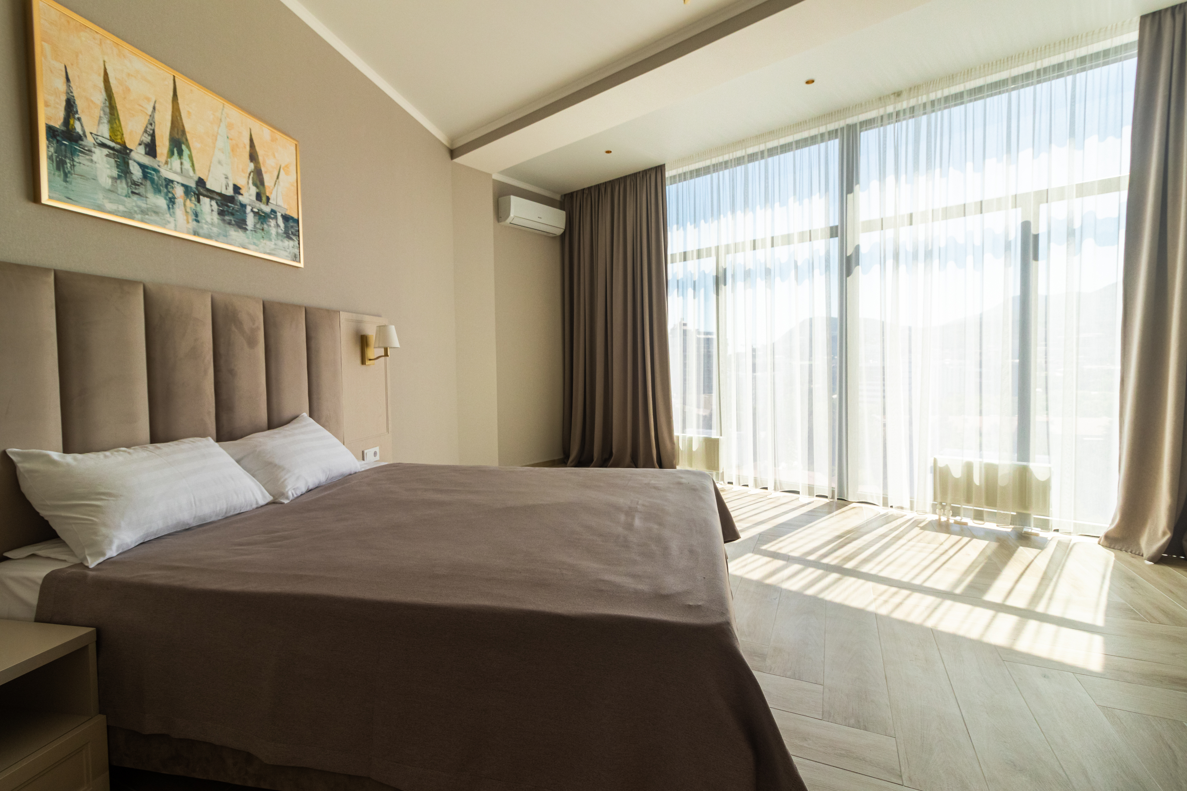 В номере: современный ремонт в светлых тонах, кондиционер и телевизор, рабочий стол и сейф, холодильник и чайная станция, Wi-Fi