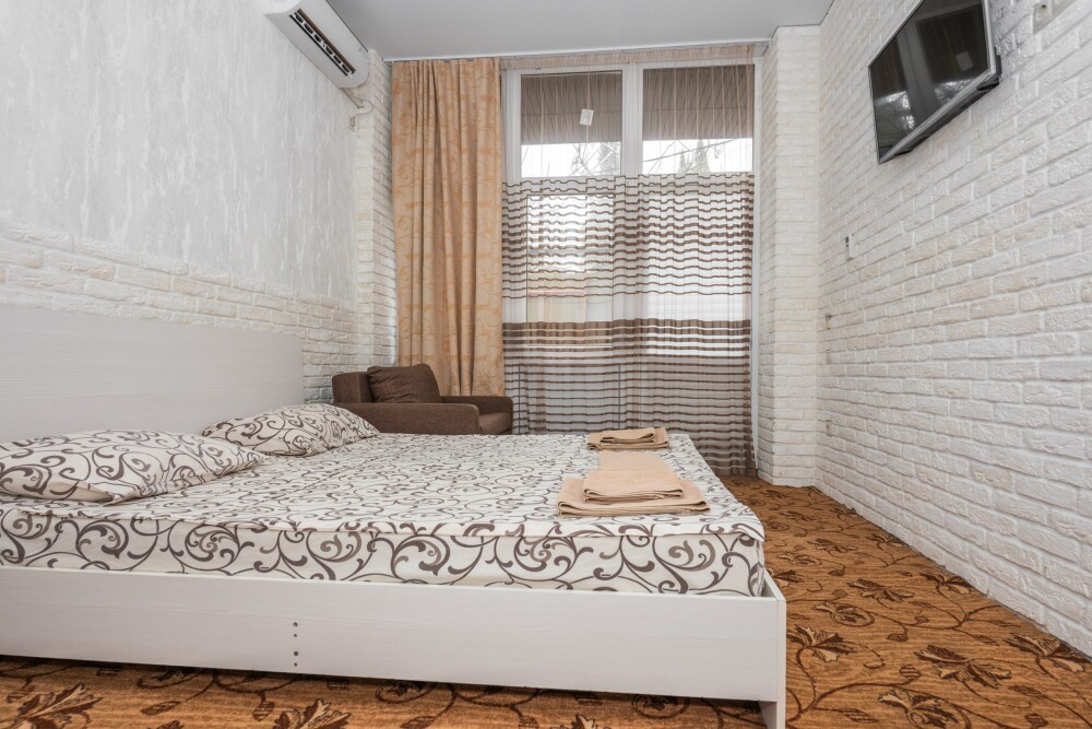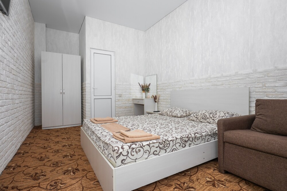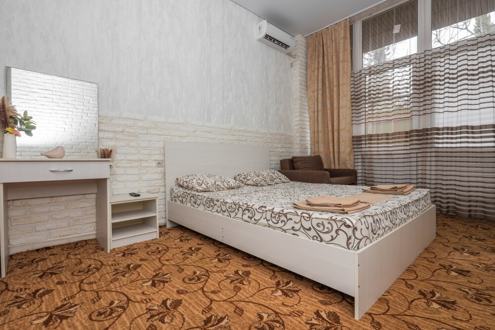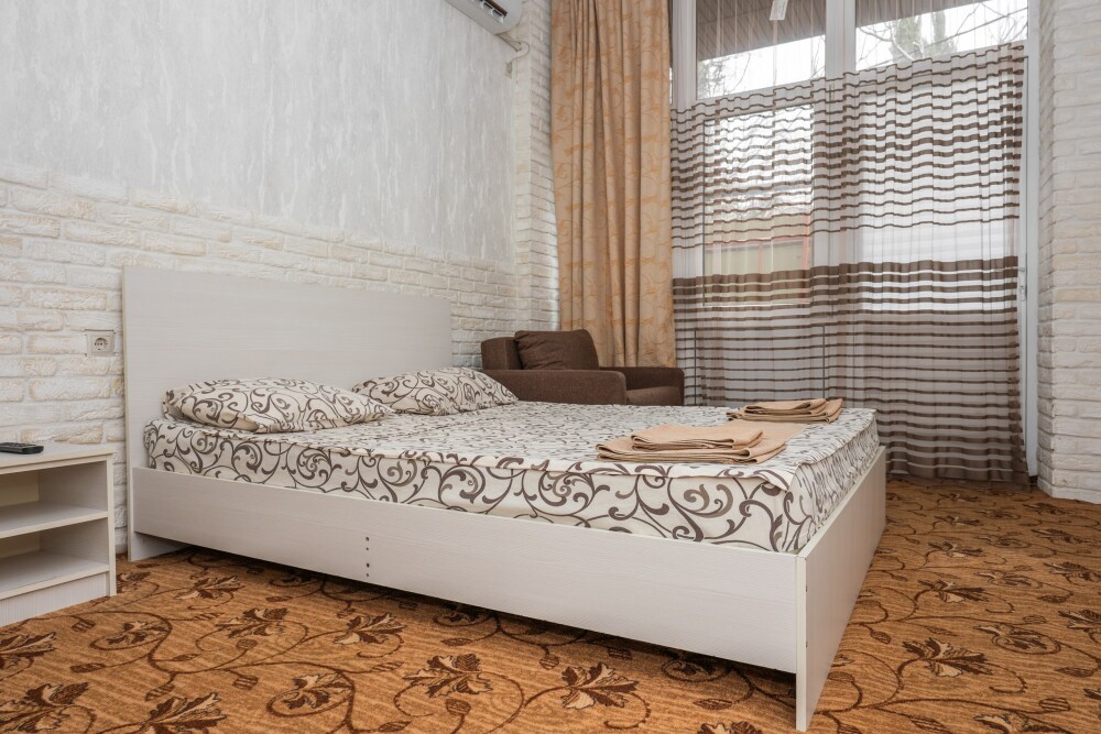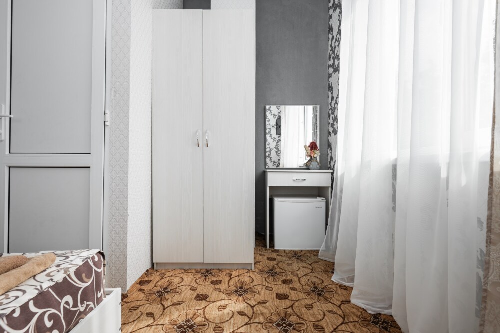 Двухместный полулюкс площадью 22 кв.м рассчитан на размещение до 2 гостей. В номере: двуспальная кровать, шкаф, комод и зеркало. Оснащение включает Wi-Fi, телевизор с кабельными каналами, кондиционер, небольшой холодильник и сушилку для одежды. Собственная ванная комната оборудована душем, предоставляются постельное бельё и полотенца.