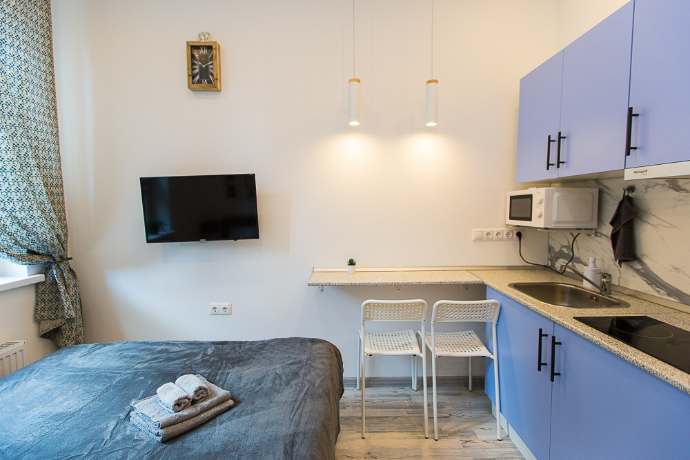 - Кухня с холодильником, плитой, микроволновкой, чайником и посудой