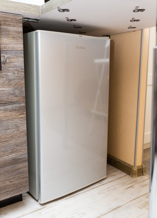 - Кухня с холодильником, плитой, микроволновкой, чайником и посудой