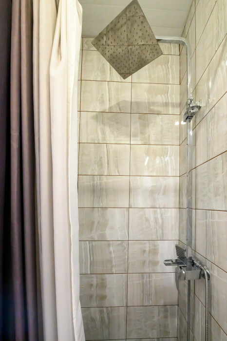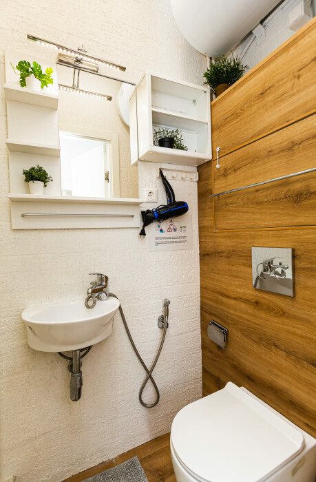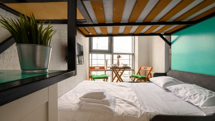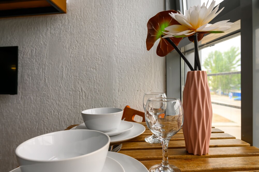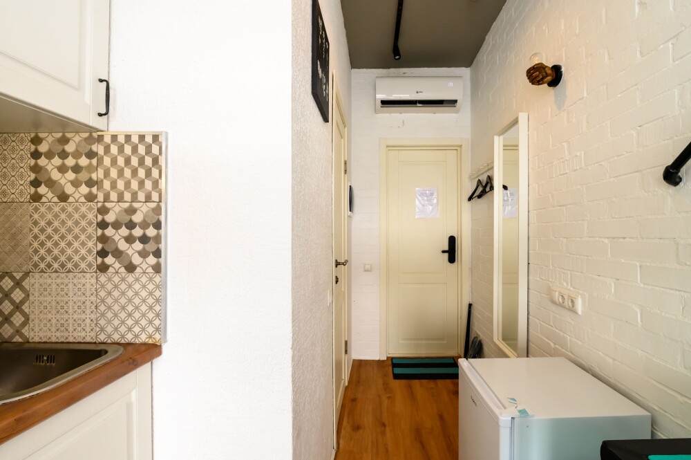 - Кухня с холодильником, плитой, микроволновкой, чайником и посудой