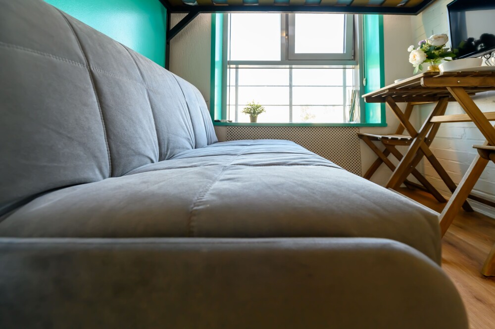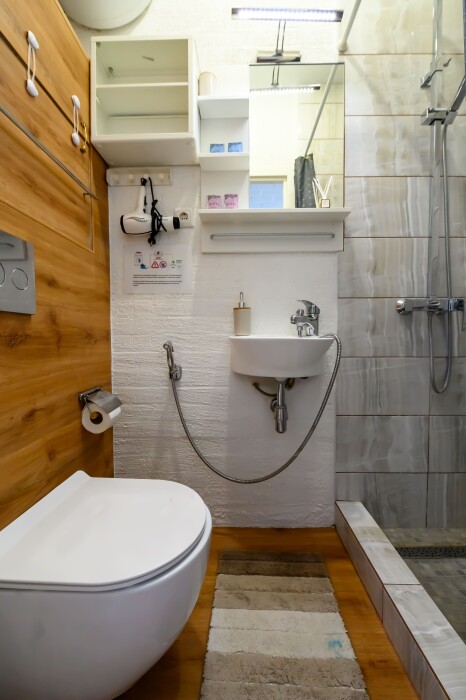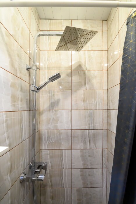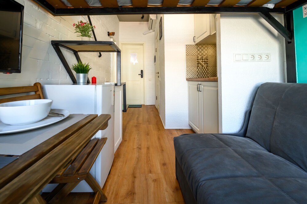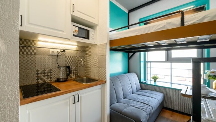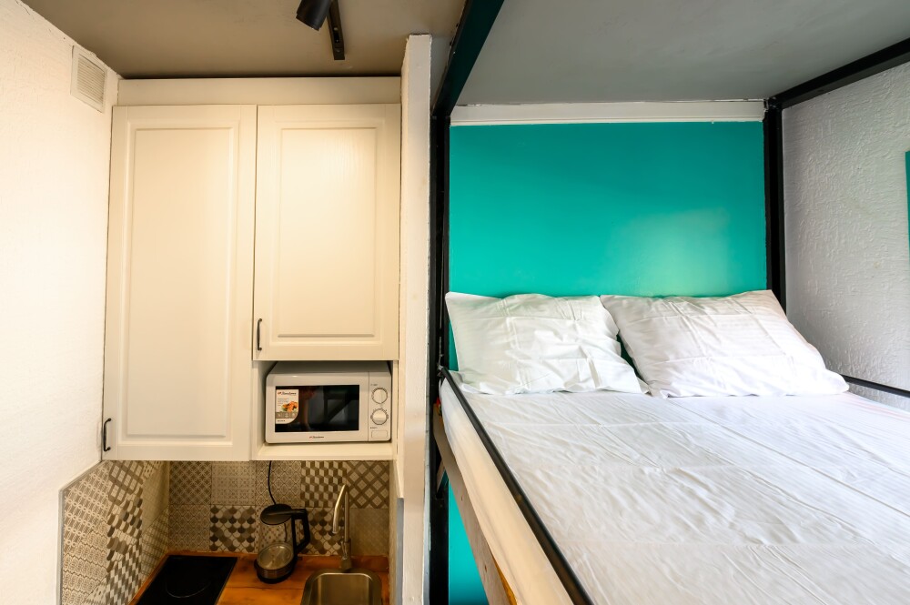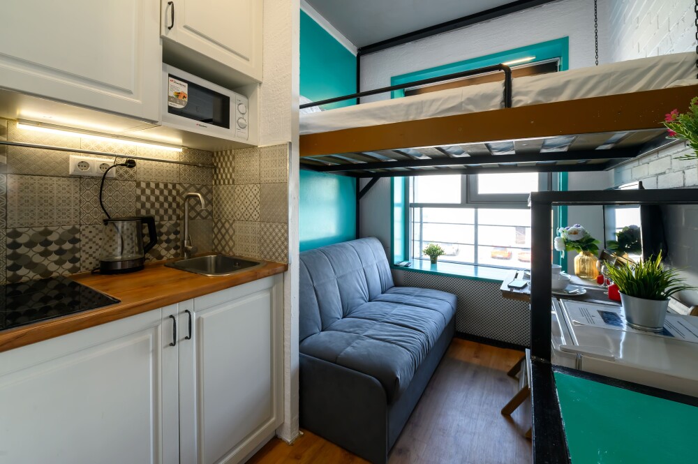 - Кухня с холодильником, плитой, микроволновкой, чайником и посудой