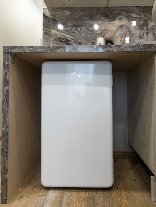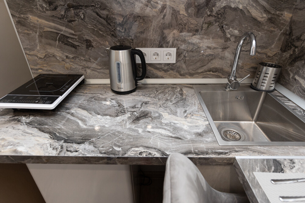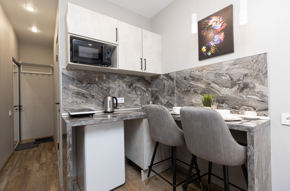 - Кухня с холодильником, плитой, микроволновкой, чайником и посудой