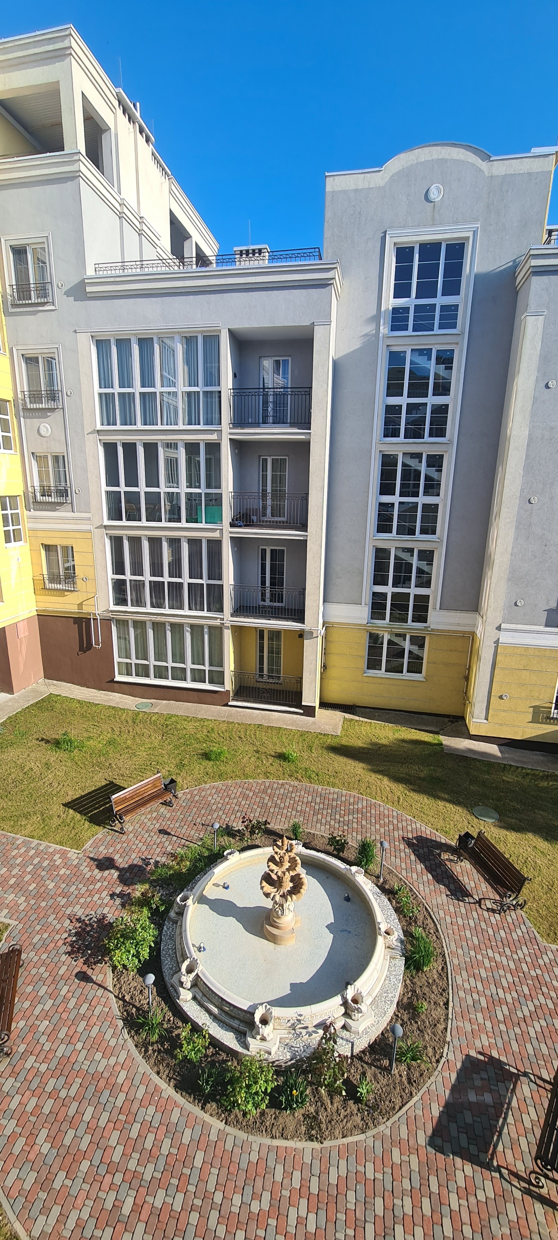 Квартира расположена в роскошном ЖК с фонтаном и розами. Дом расположен в самом идеальном месте: в 5-ти минутах пешком от моря, в 5-ти минутах от центра и от парка Беккер, от прозрачного озера Синявинского в 7-ми минутах ходьбы. Ближайшие Кафе и рестораны прямо за территорией ЖК.