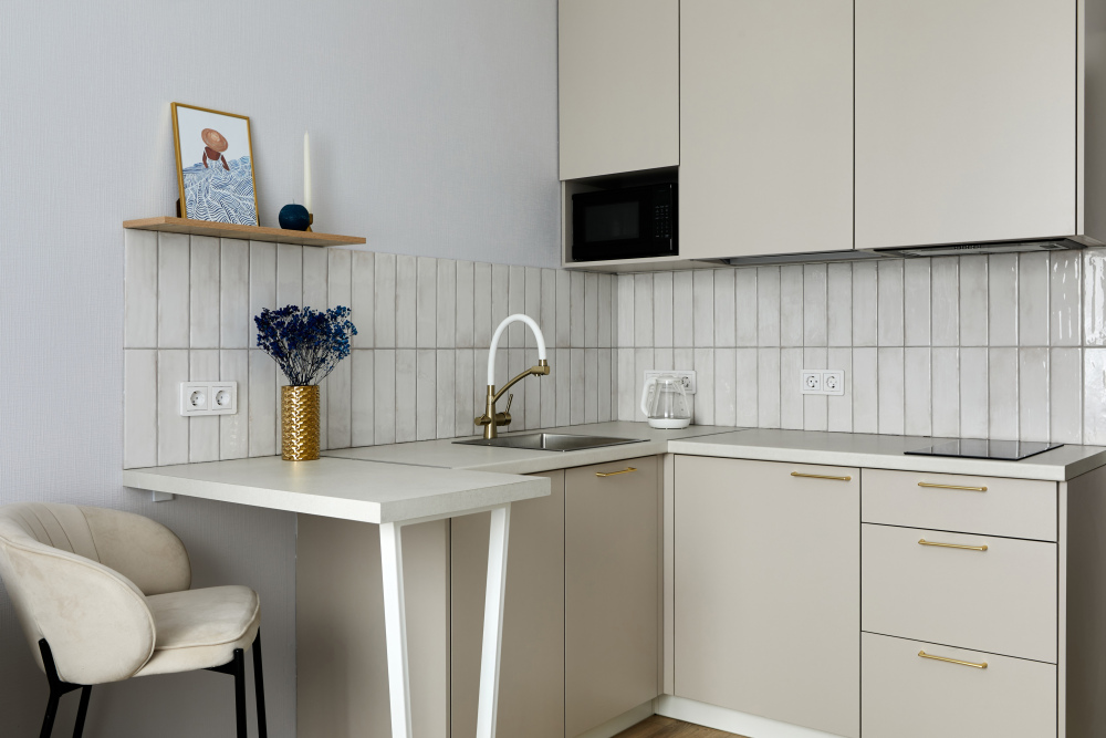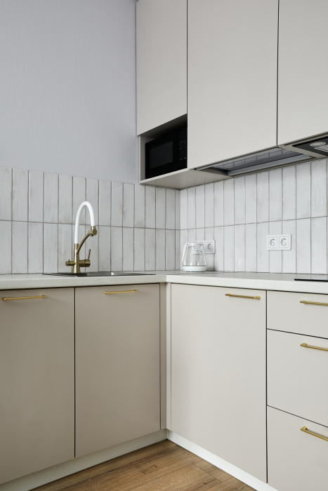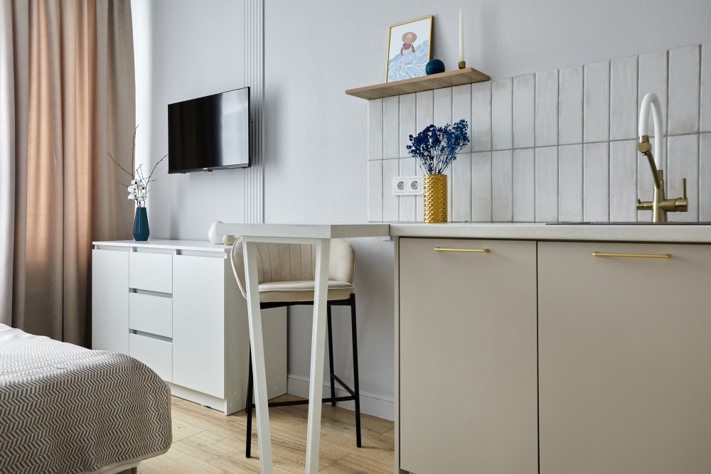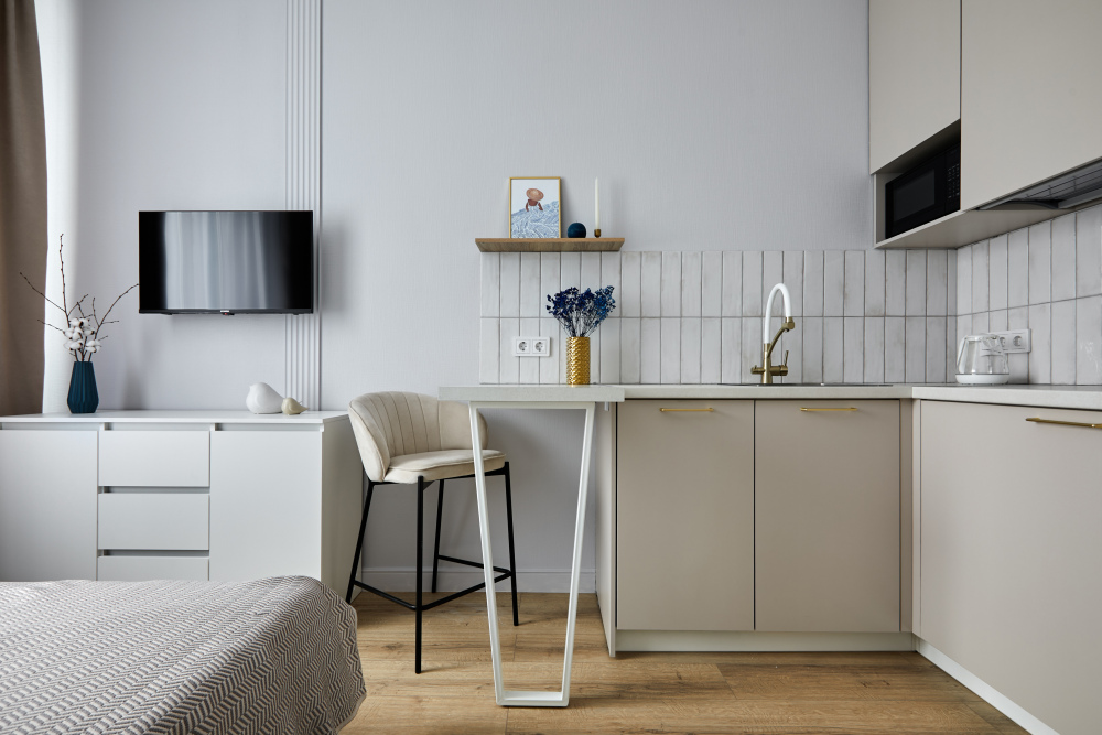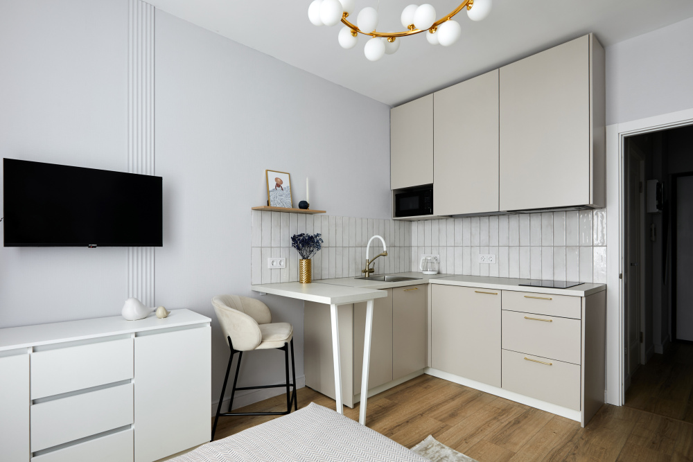 - Кухня-студия: все необходимое для приготовления еды (холодильник, варочная панель, посудомоечная машина, посуда, свч, чайник.