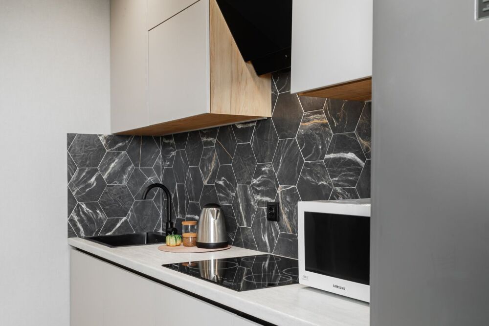 - Полностью оборудованная кухня с необходимой техникой и посудой.