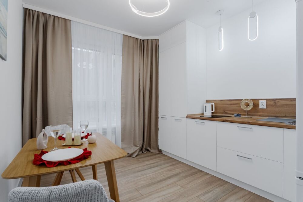- Полностью оборудованная кухня с необходимой техникой и посудой.