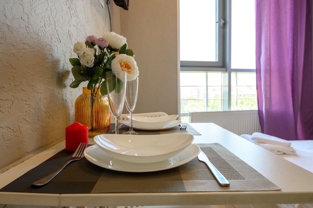 - Кухня с холодильником, плитой, микроволновкой, чайником и посудой