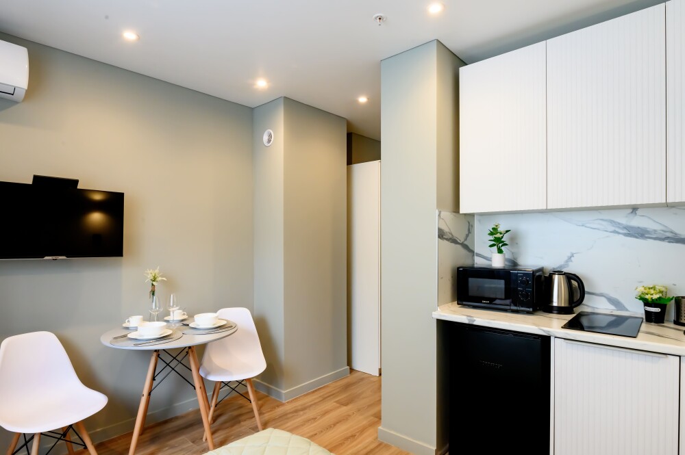 - Кухня с холодильником, плитой, микроволновкой, чайником и посудой