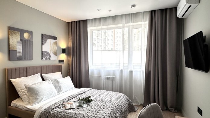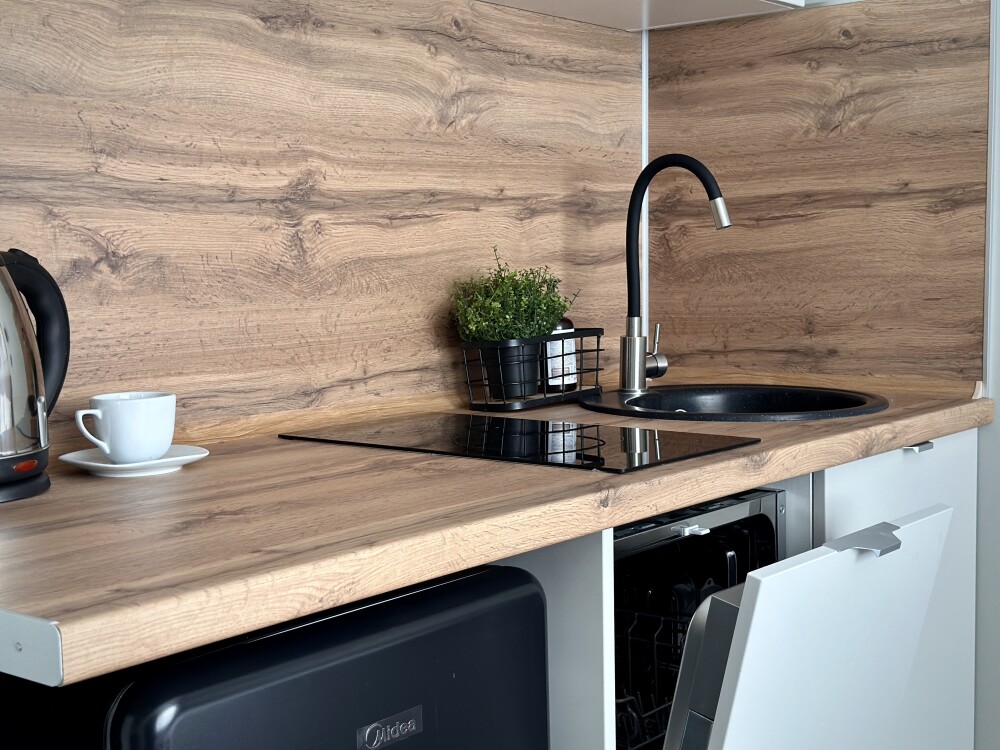 - Кухня с холодильником, плитой, микроволновкой, чайником и посудой