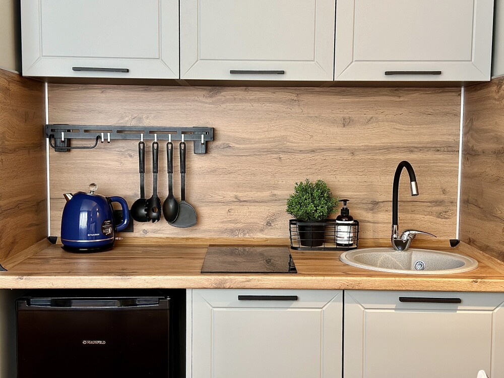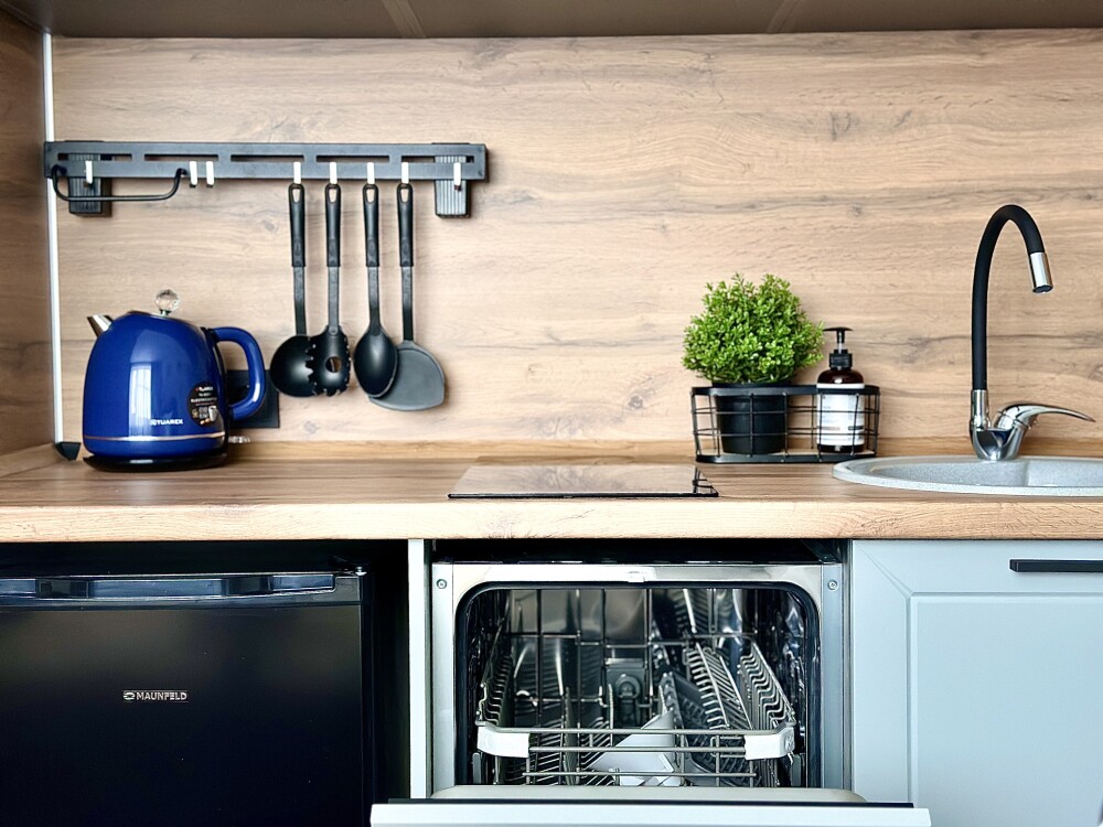- Кухня с холодильником, плитой, микроволновкой, чайником и посудой