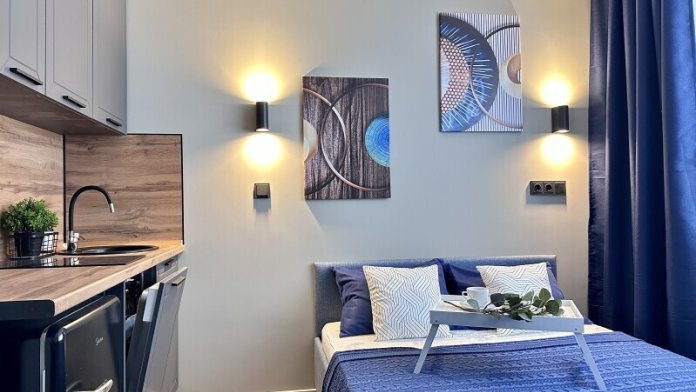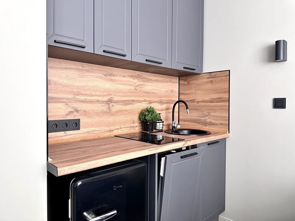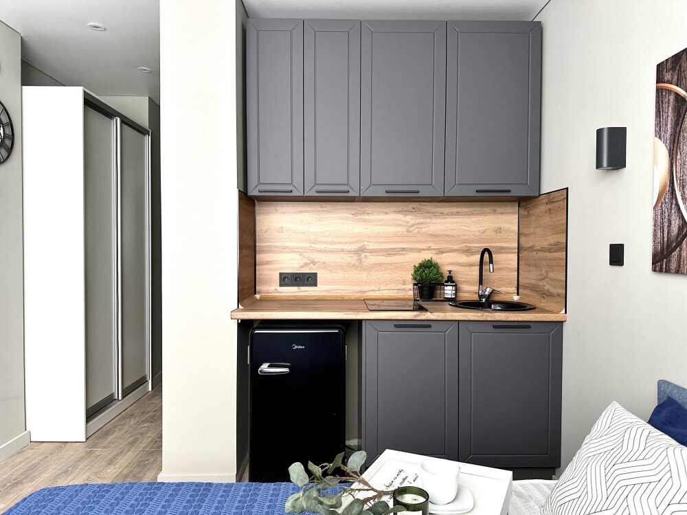 - Кухня с холодильником, плитой, микроволновкой, чайником и посудой