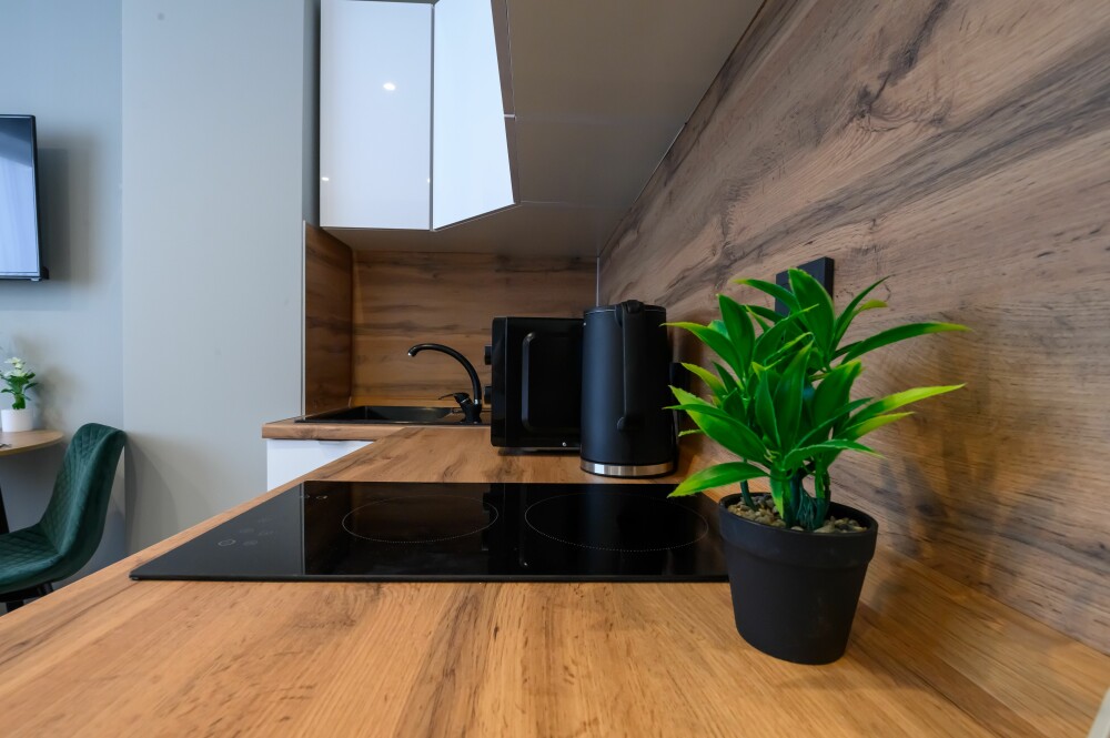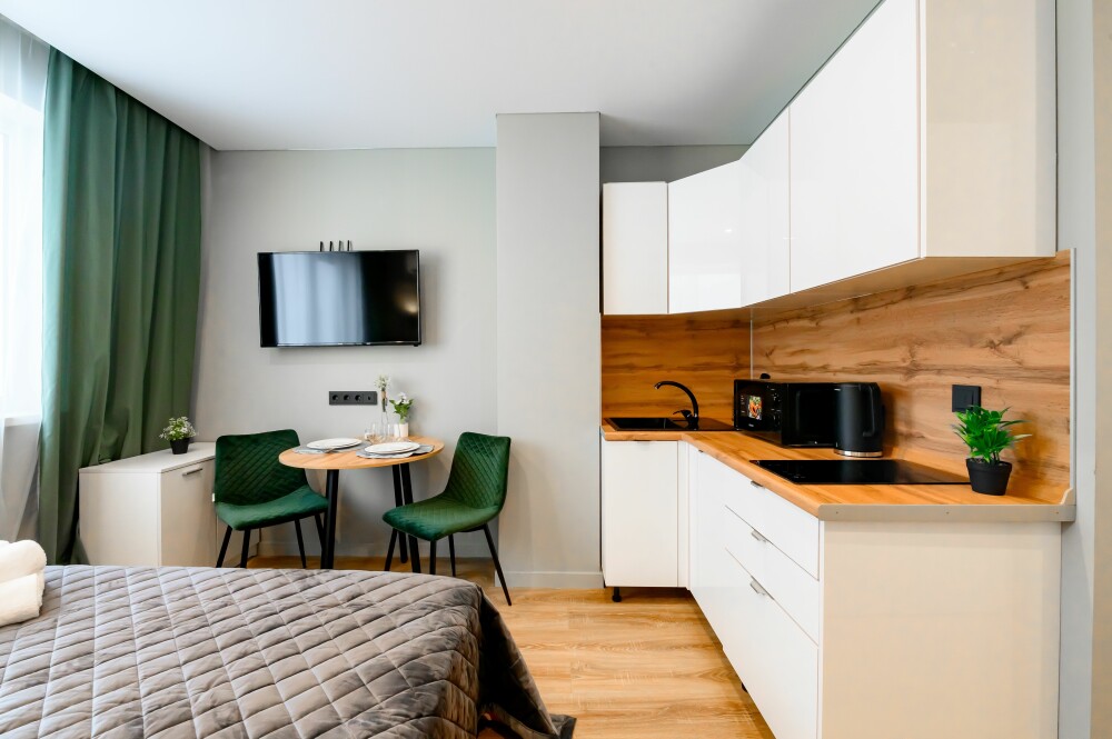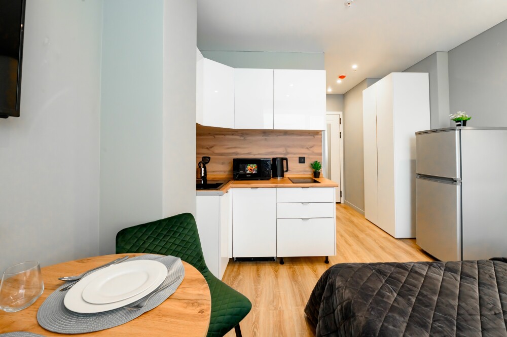 - Кухня с холодильником, плитой, микроволновкой, чайником и посудой