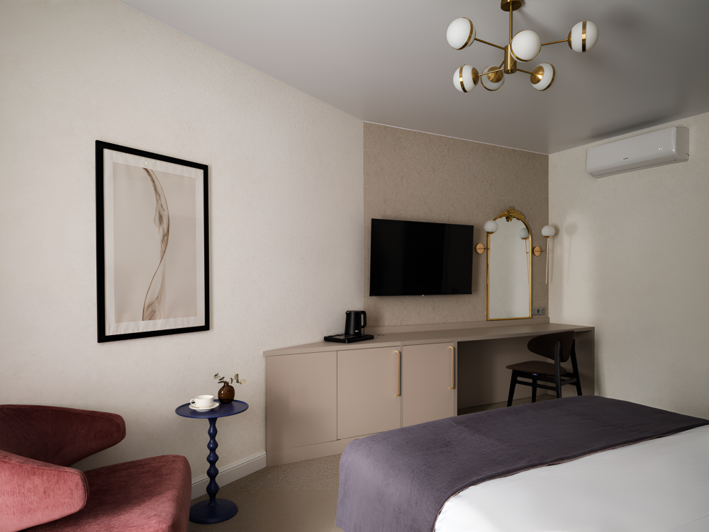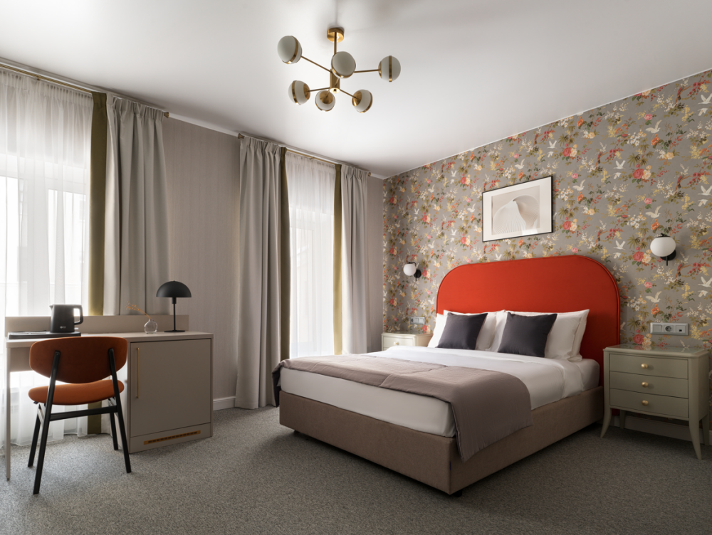 Спальное место организовано стильной двуспальной кроватью-трансформером с ортопедическим матрасом. В номере есть кондиционер, сейф, стол с чайной станцией.