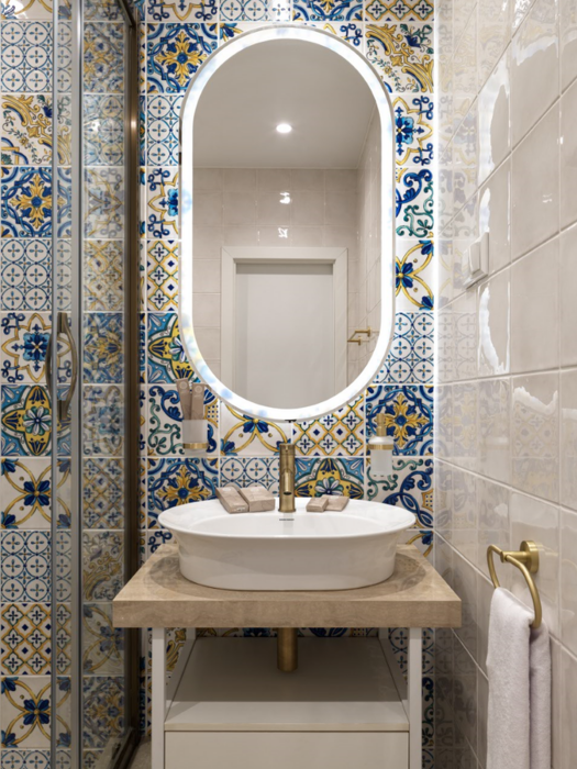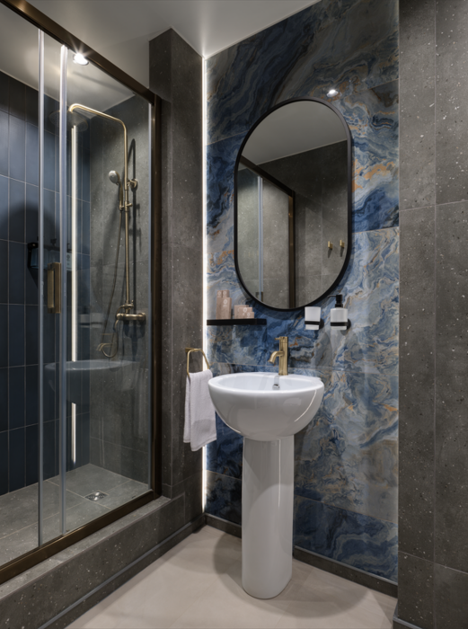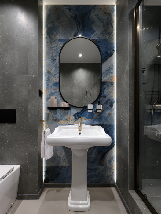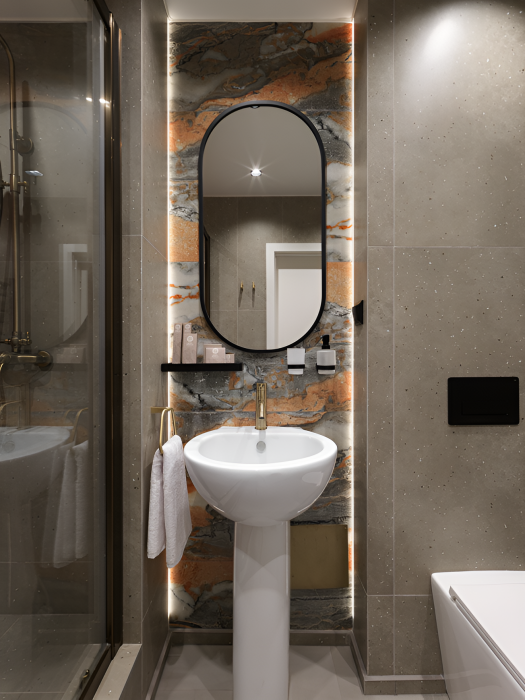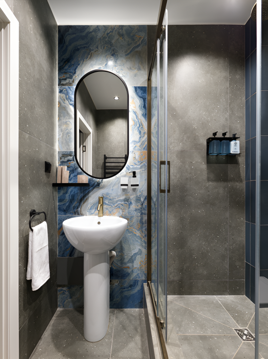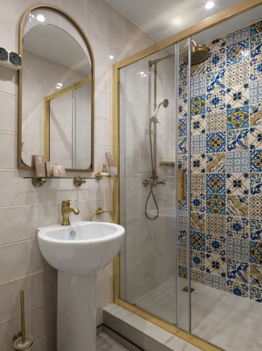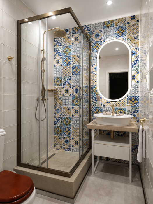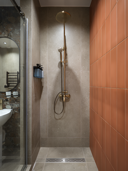 Собственная ванная комната оснащена современной душевой кабиной. В номере мягкие халаты, набор качественных косметических принадлежностей и фен.