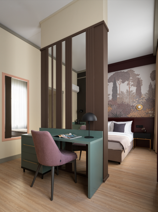 Отель «Innостранец» расположен в тихом квартале исторического центра города. Здесь вы окажетесь в самом сердце культурной жизни, сохраняя при этом ощущение уединения, покоя и защищённости от городской суеты. Небольшое количество номеров создаёт камерную, почти домашнюю атмосферу. В отеле всего 14 уникальных дизайнерских номеров. Они объединены общей концепцией, но каждый обладает собственной стилистикой, настроением и характером — чтобы каждый гость мог найти пространство, которое откликается именно ему.