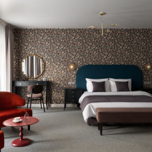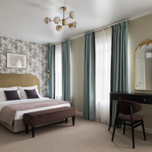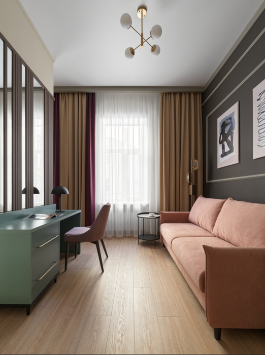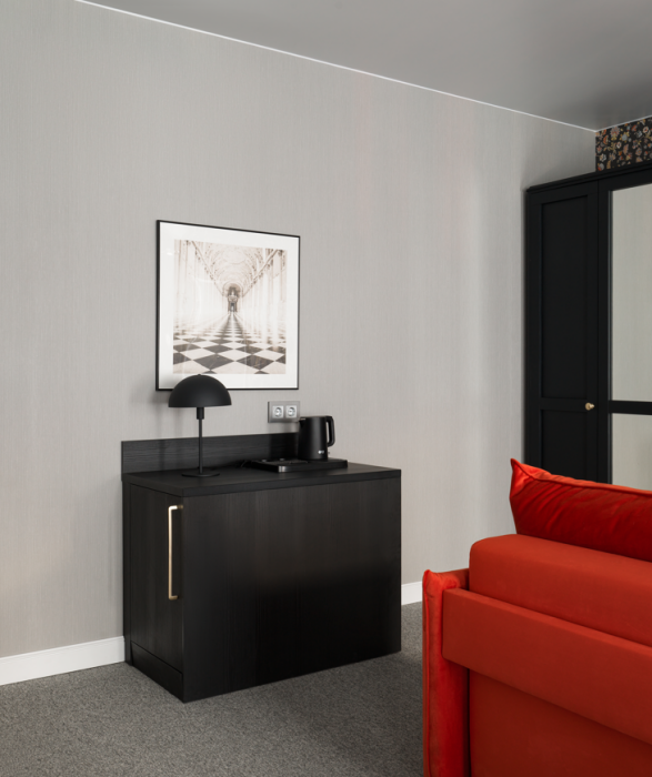 Спальное место организовано стильной двуспальной кроватью-трансформером с ортопедическим матрасом. Дополнительное место - диван. В номере есть кондиционер, сейф, стол с чайной станцией.