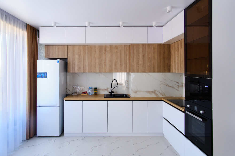 - плита, духовка, микроволновка, вытяжка, чайник, посудомоечная машина, холодильник;