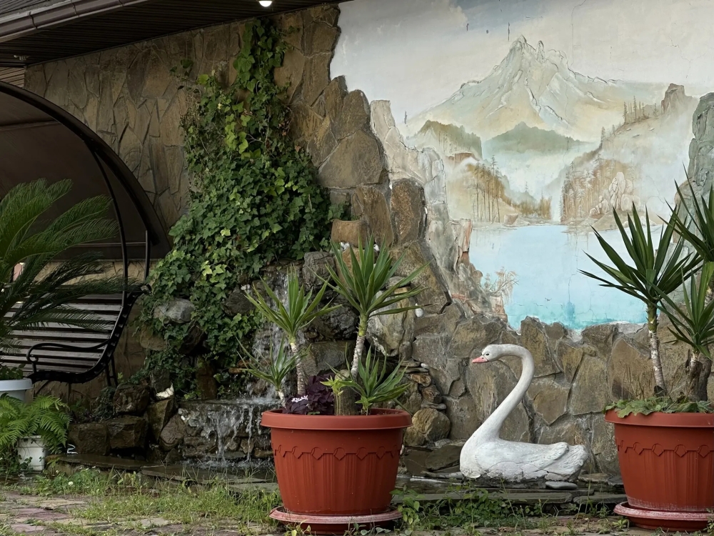Гостевой дом имеет свою закрытую территорию с парковкой, зелёной зоной, мангалом, беседкой для отдыха, детской игровой зоной, бассейном, кафе-столовой и пекарней.