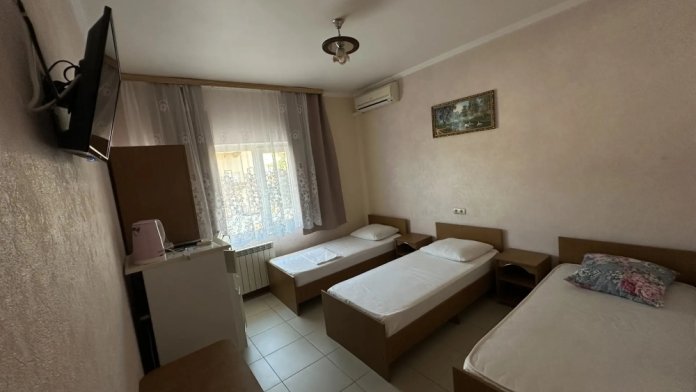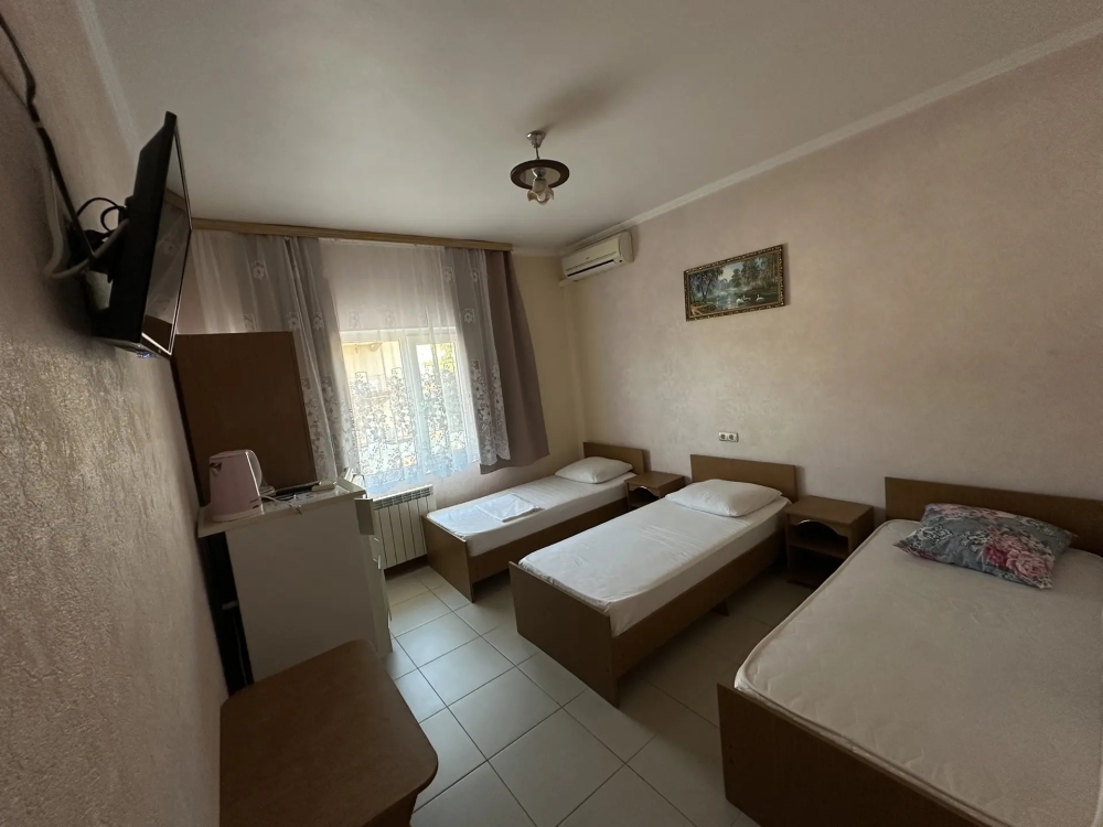 Номер с тремя 1.5 спальными кроватями, кондиционер, холодильник, телевизор, удобства в номере. Номера с балконом.