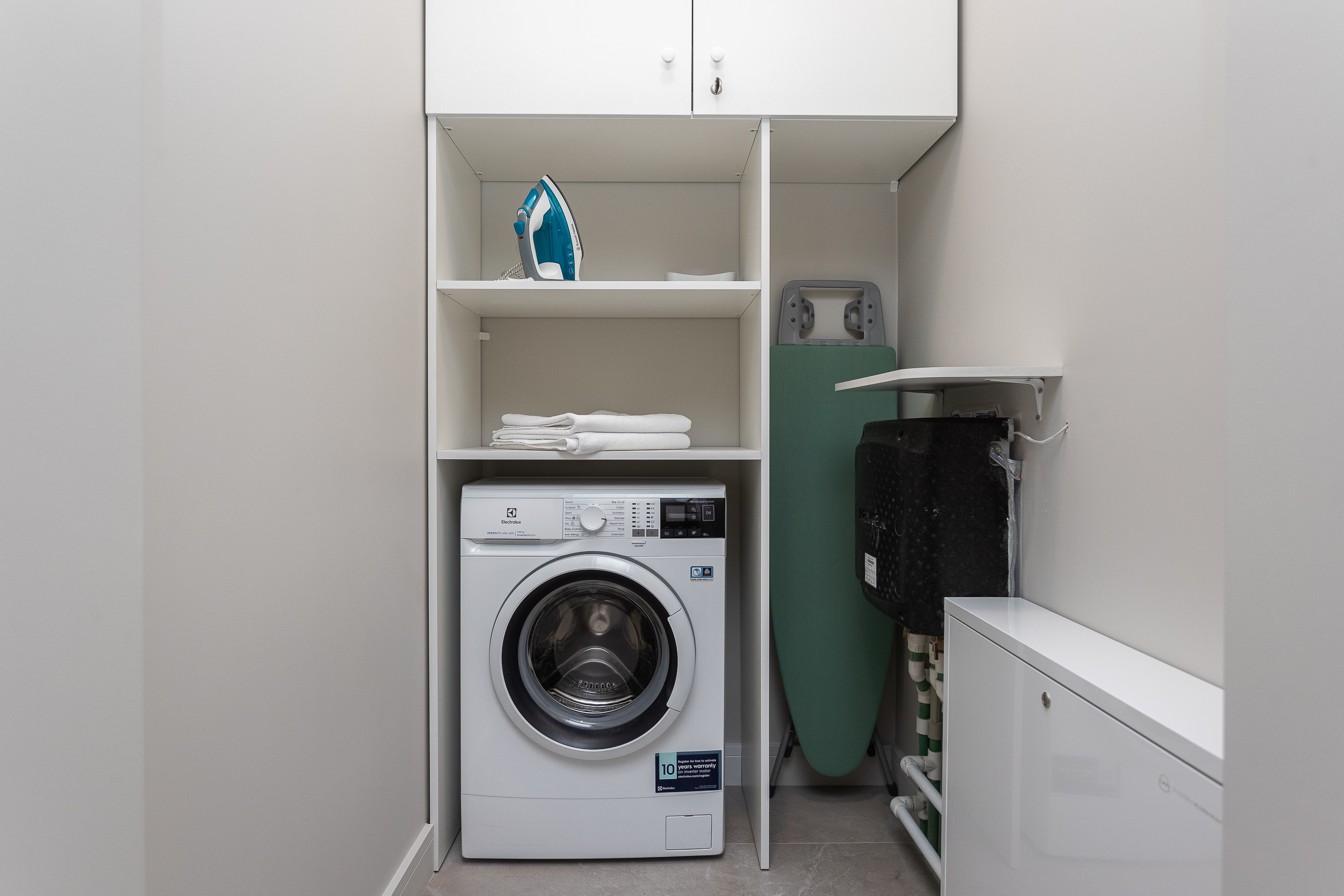 Современная техника: Smart-TV с интернет-подключением, кондиционер, стиральная машина, бытовые устройства (пылесос, утюг, гладильная доска, фен).