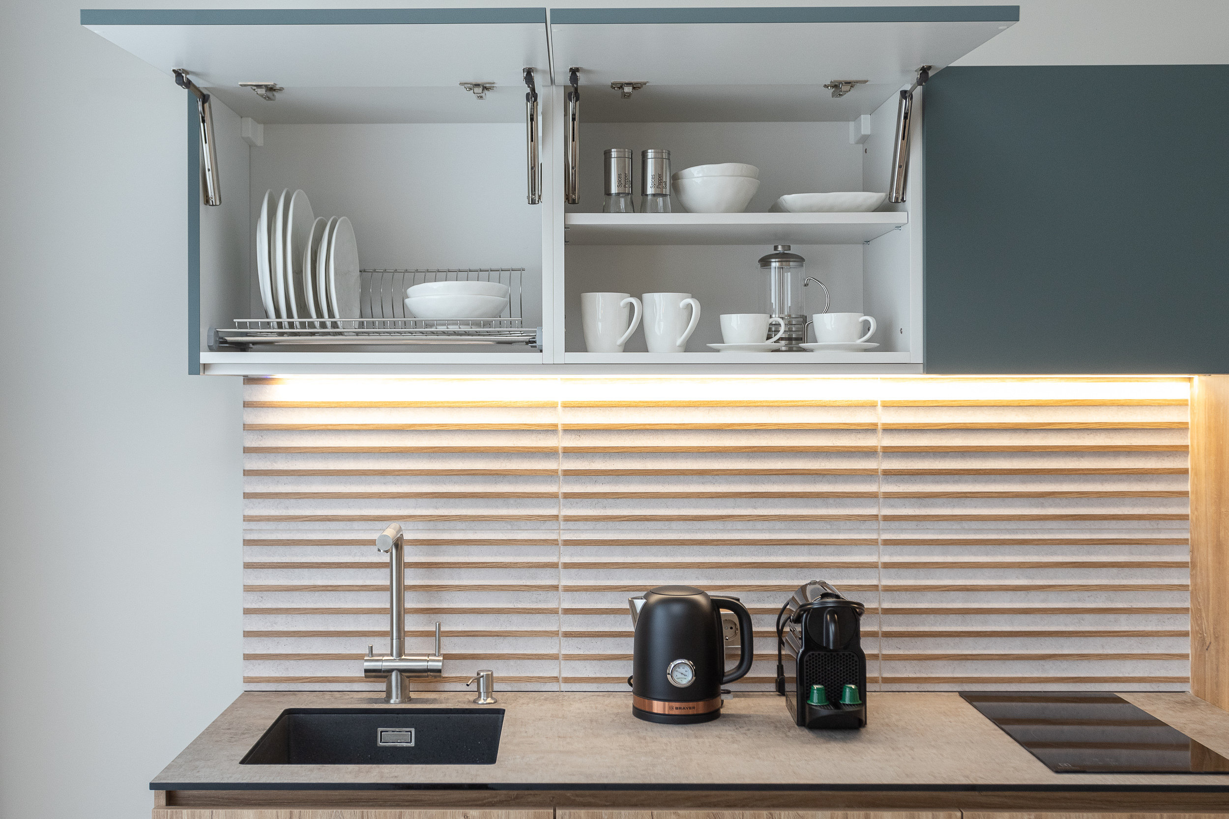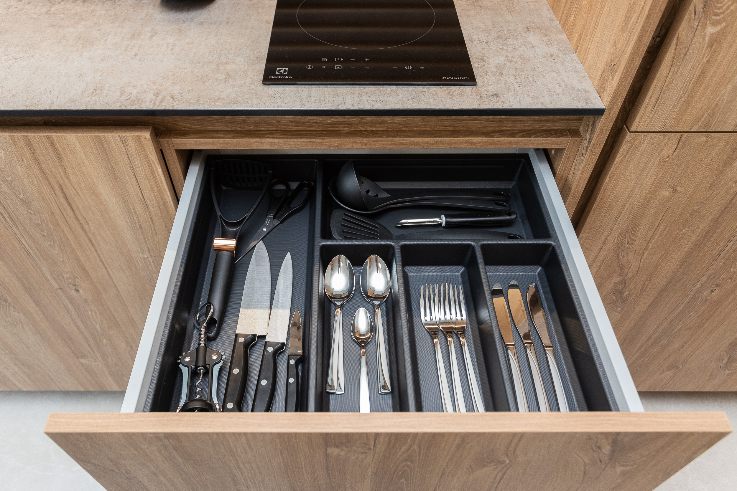 Кухня: индукционная плита, микроволновка, духовка, холодильник, полный набор посуды и столовые приборы.