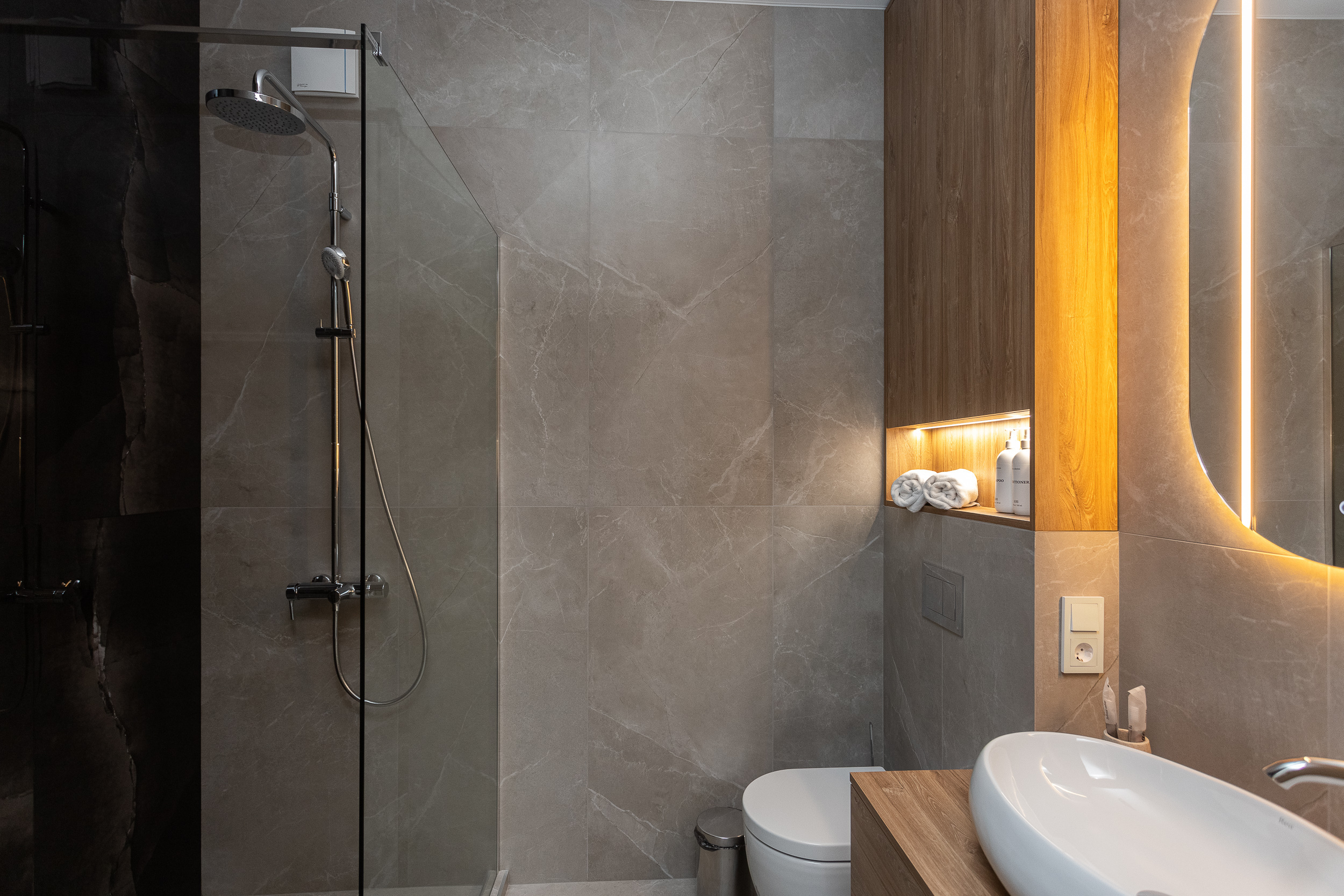 Ванная комната: просторная душевая кабина, полная комплектация гигиеническими средствами (включая зубные щётки), индивидуальный комплект полотенец для каждого гостя, плюс дополнительно пляжные полотенца.