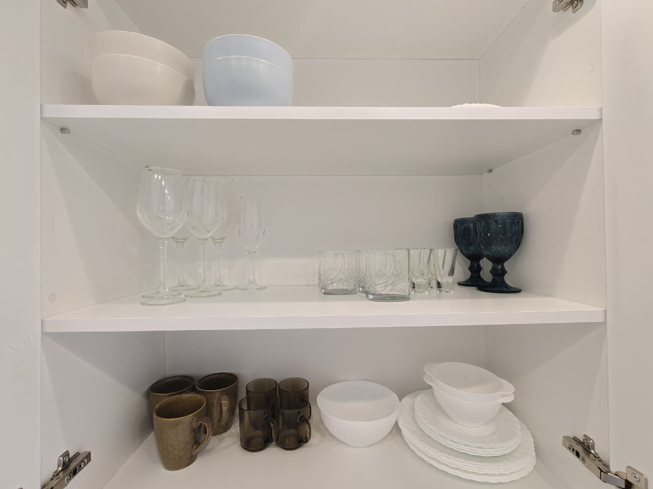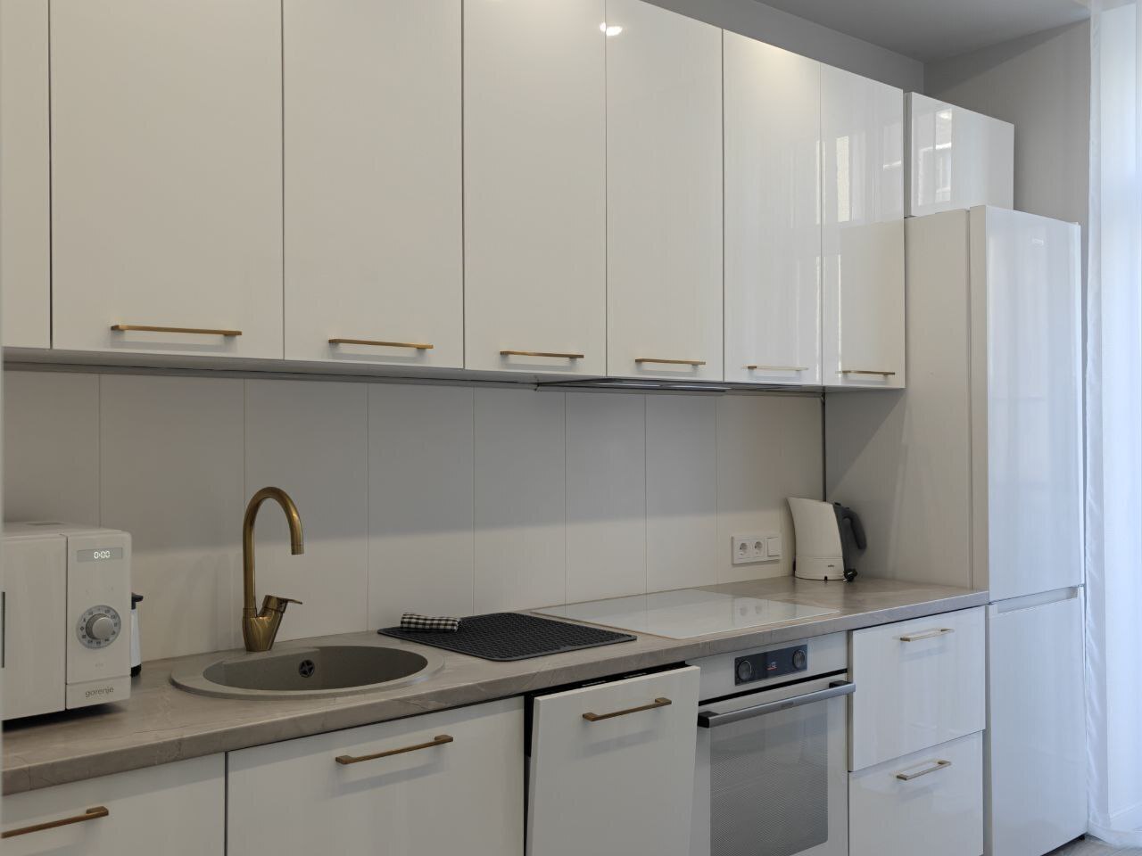 Кухня: индукционная плита, микроволновка, духовка, холодильник, полный набор посуды и столовые приборы.