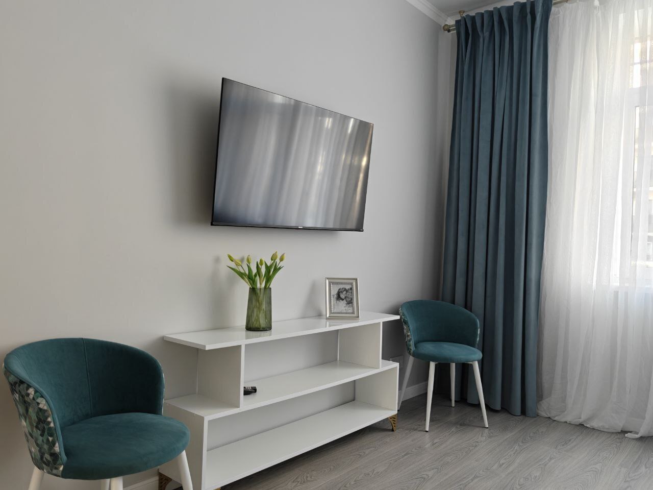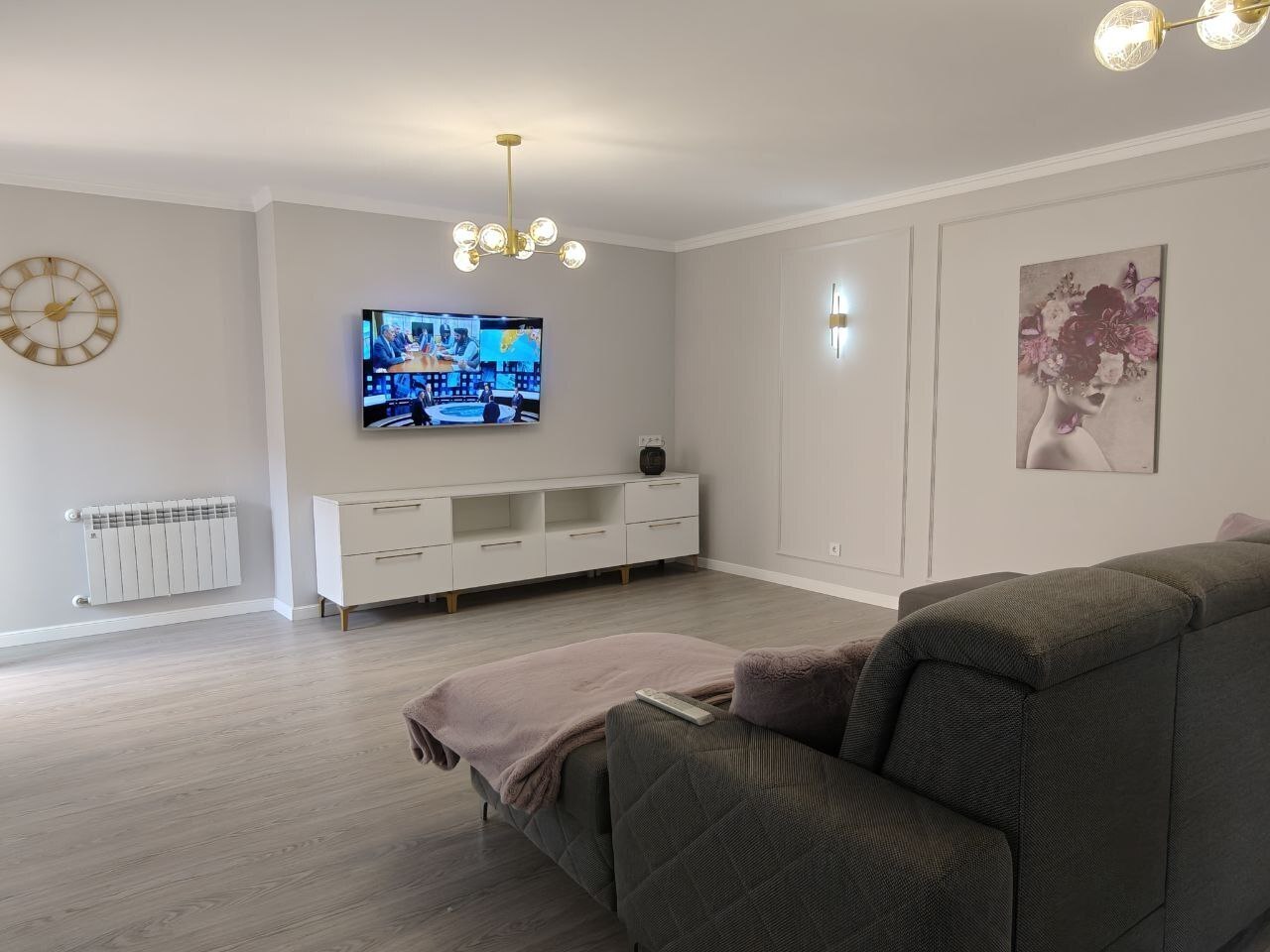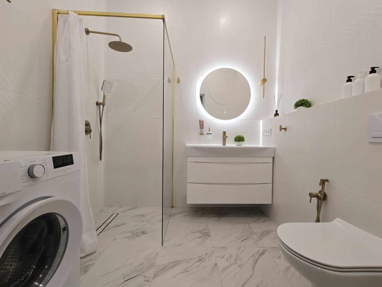 Современная техника: Smart-TV с интернет-подключением, кондиционер, стиральная машина, бытовые устройства (пылесос, утюг, гладильная доска, фен).