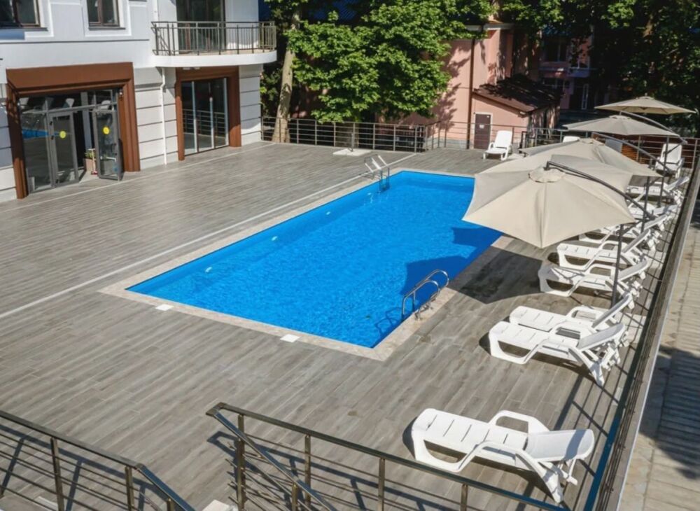 — бассейн возле дома с шезлонгами и зонтами, для удобства рядом расположены туалеты ,