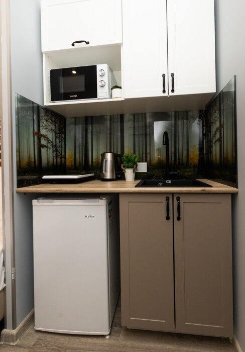 - Кухня с холодильником, плитой, микроволновкой, чайником и посудой