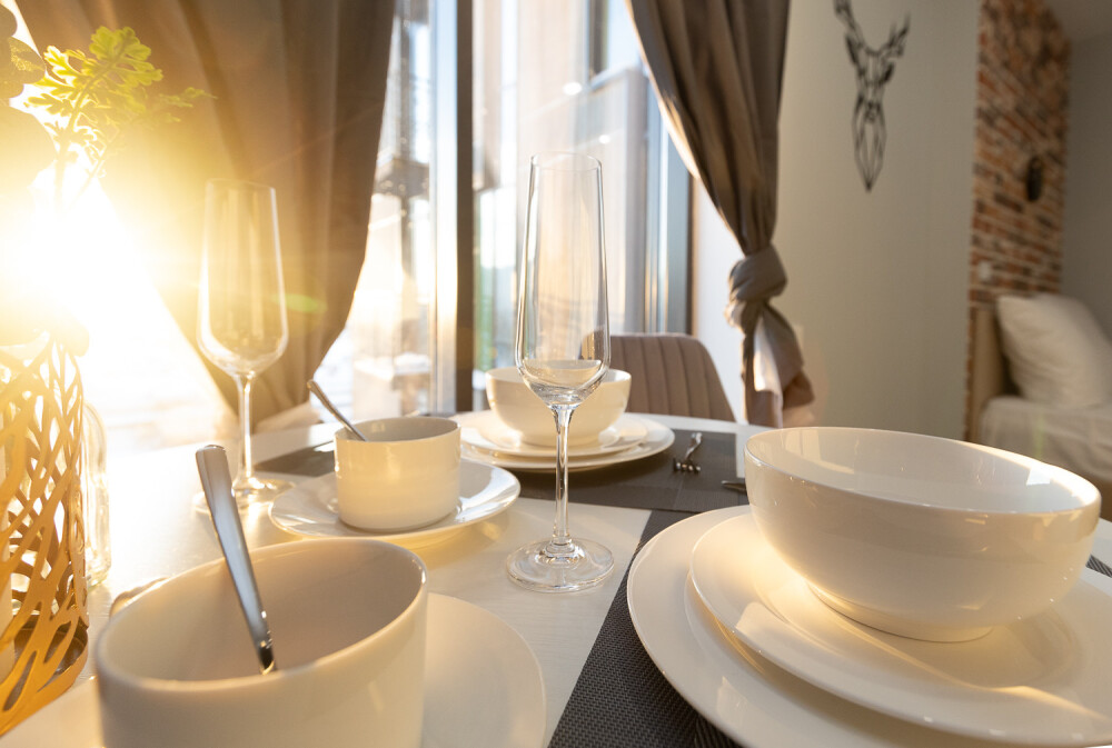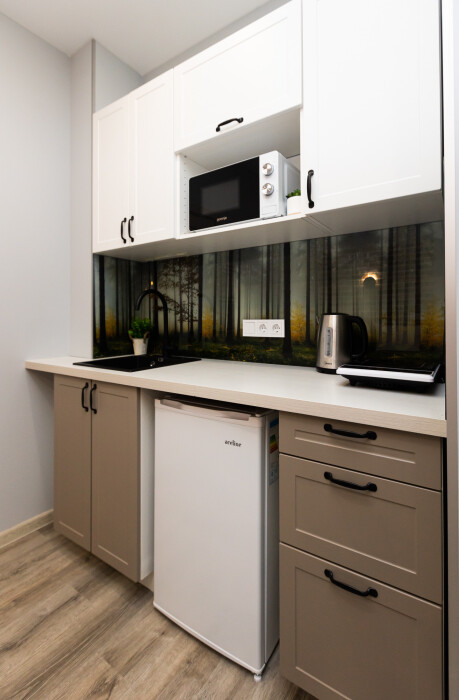 - Кухня с холодильником, плитой, микроволновкой, чайником и посудой