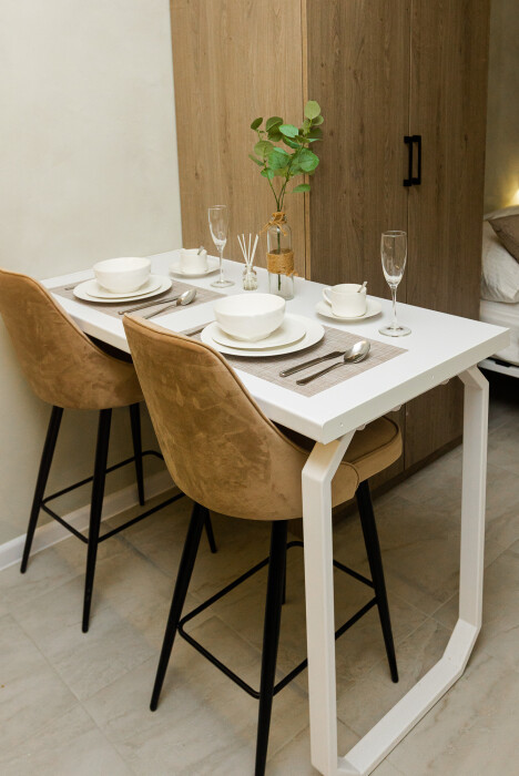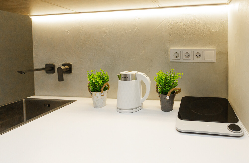 - Кухня с холодильником, плитой, микроволновкой, чайником и посудой