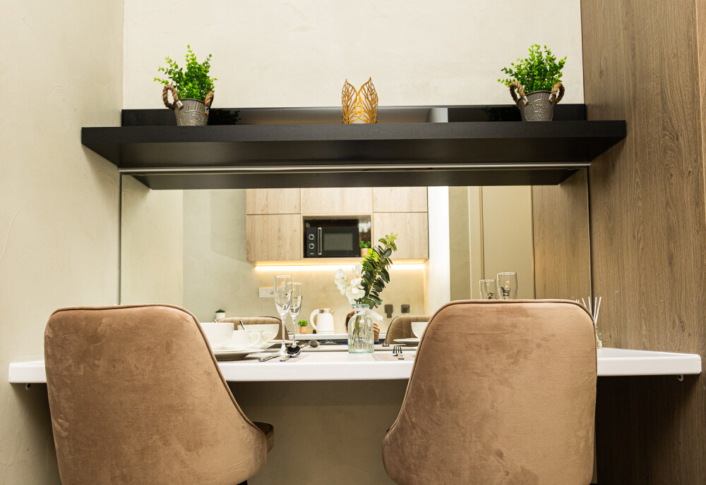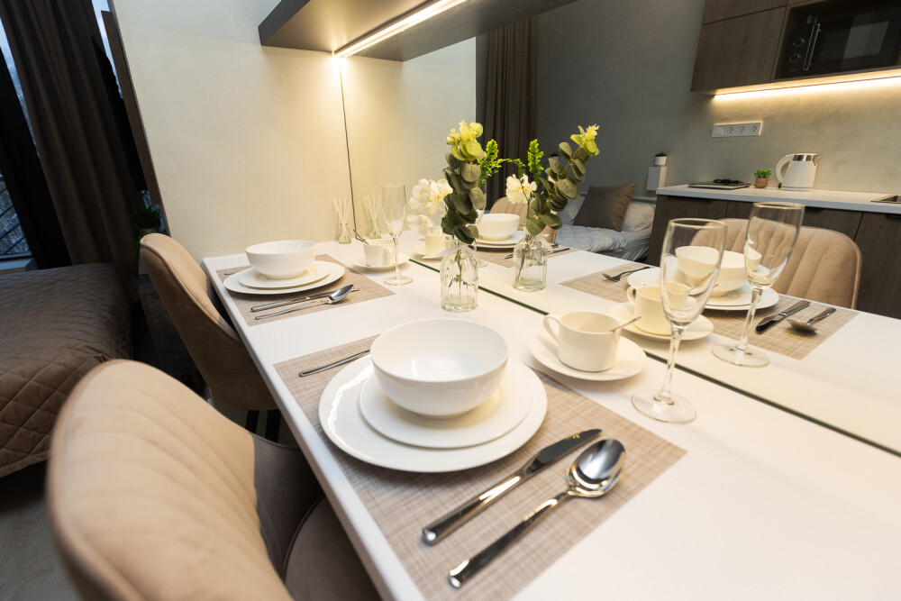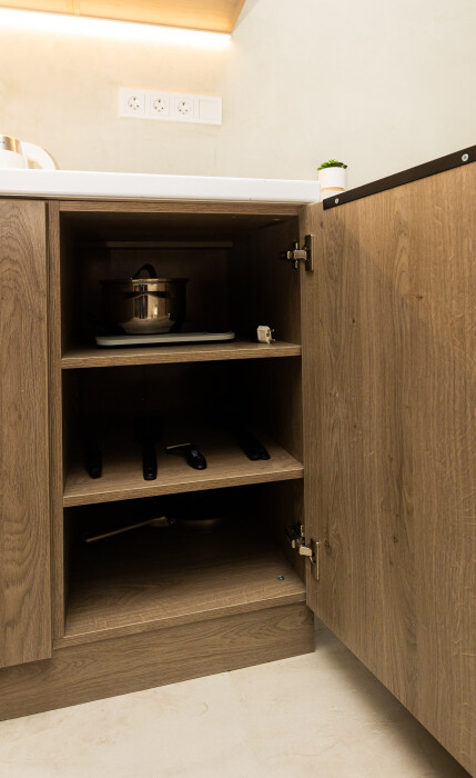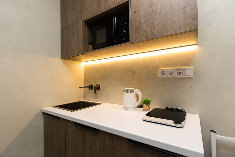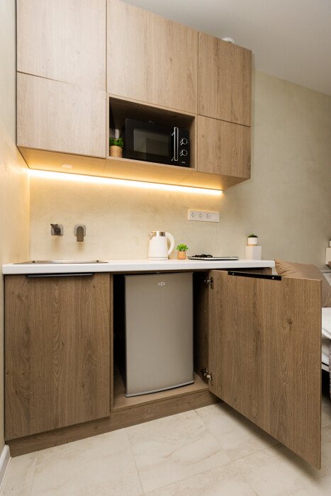 - Кухня с холодильником, плитой, микроволновкой, чайником и посудой