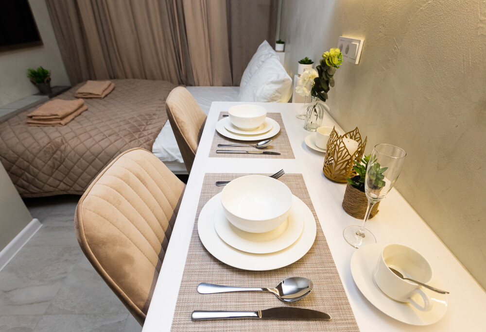 - Кухня с холодильником, плитой, микроволновкой, чайником и посудой