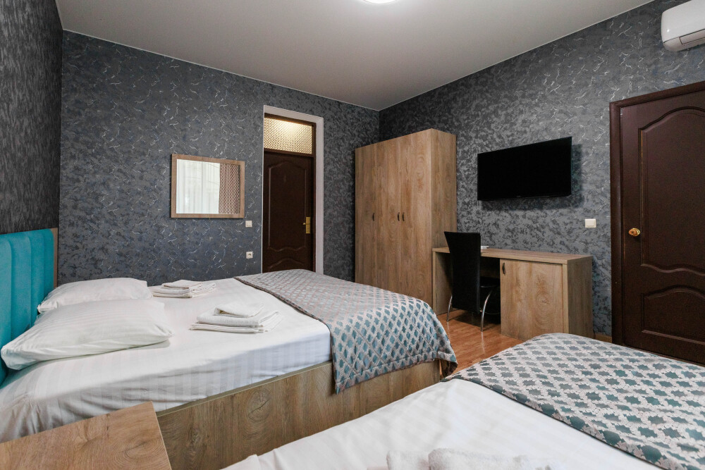 Двуспальная и односпальная кровати обеспечат Вам отличный сон и отдых после активного дня. Кондиционер, холодильник, ЖК телевизор и санузел с душем обеспечат Ваше удобство.