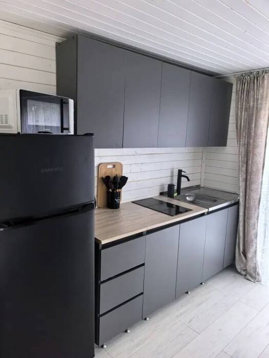 Кухня полностью оборудована всем необходимым: холодильник , варочная плита, СВЧ, чайник, посуда и столовые приборы.