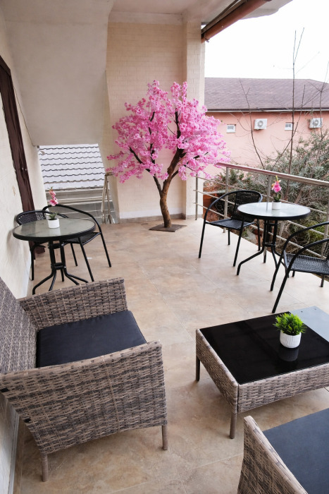 Особенностью номера является выход на небольшую общую террасу, рассчитанную на три номера. На террасе установлен столик со стульями, где можно приятно провести время на свежем воздухе, выпить чашку чая или кофе.