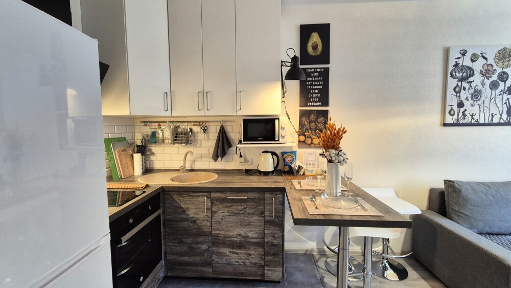 - Холодильник, плита, микроволновая печь, чайник, стиральная машина