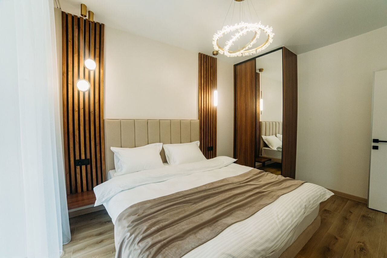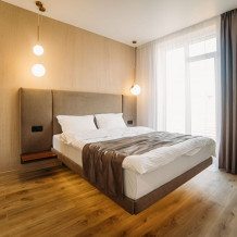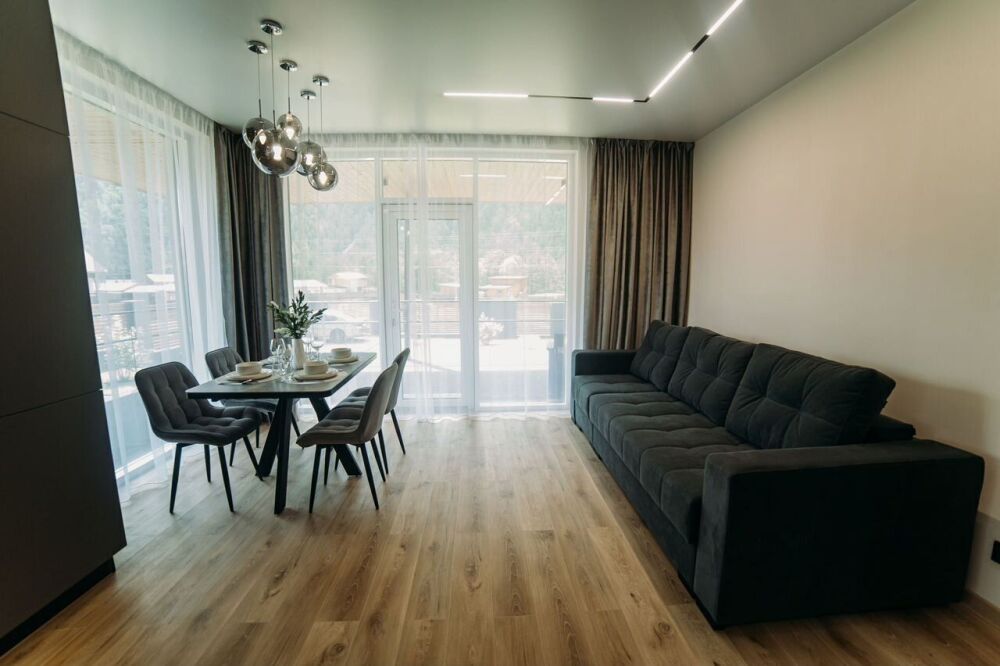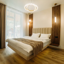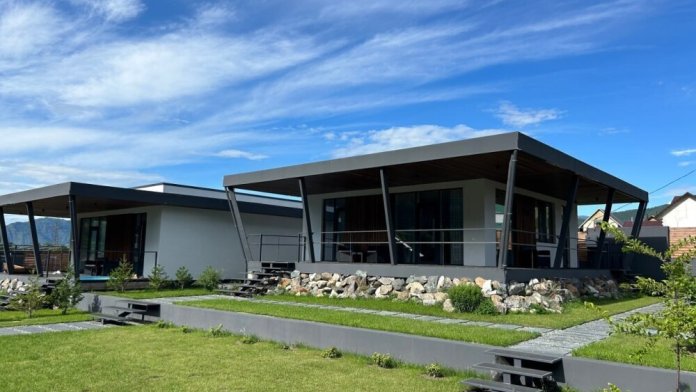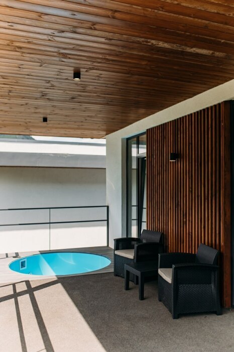 В доме: просторная гостиная с кухонной зоной, 2 спальни с двуспальными кроватями, ванная комната. У каждого дома большая терраса с уличной мебелью, а так же индивидуальная купель.