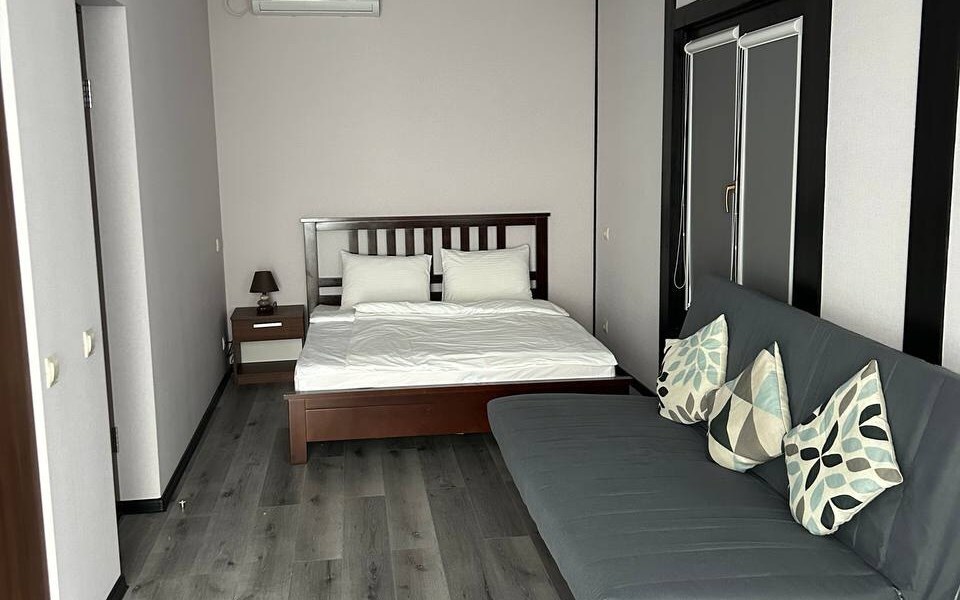 В номере двуспальная кровать и раскладной диван/раскладушка.