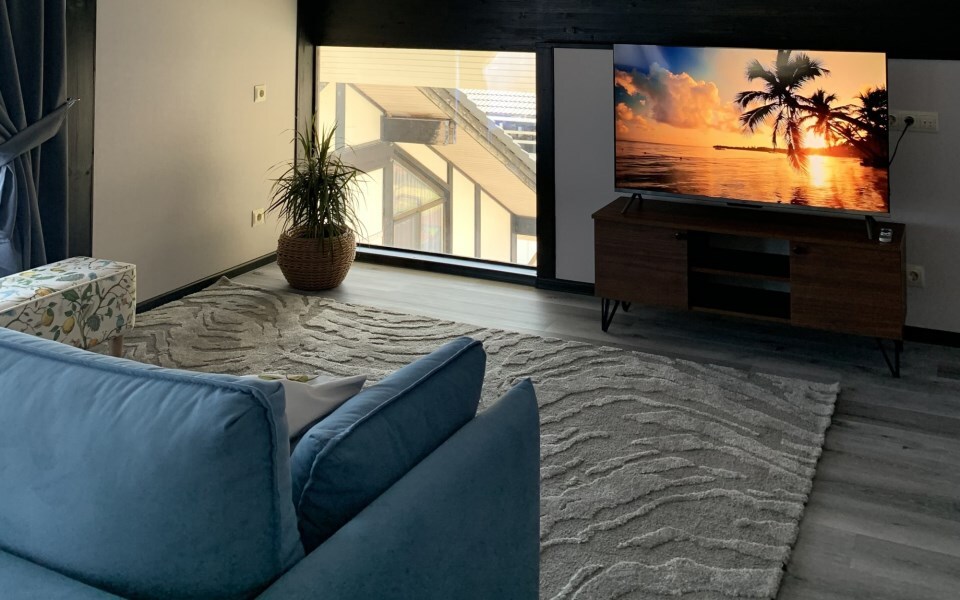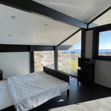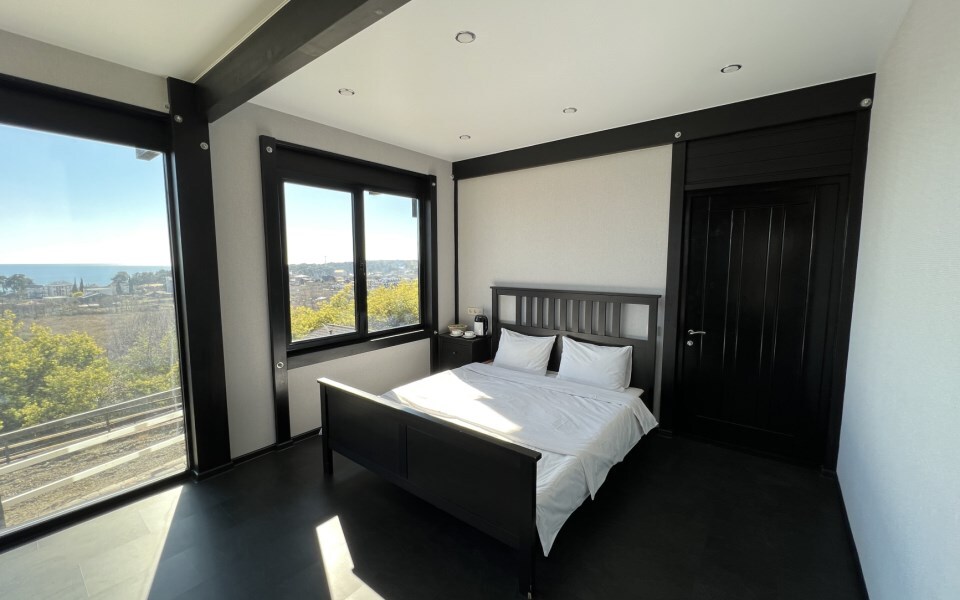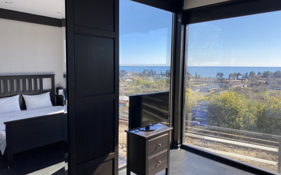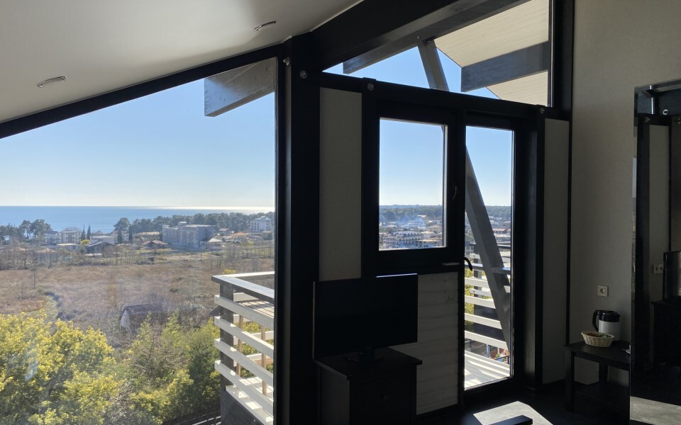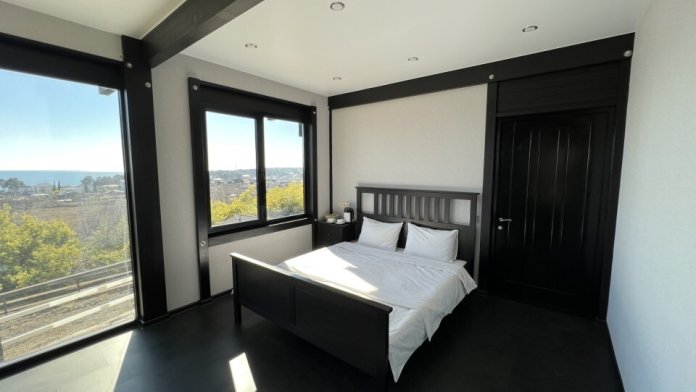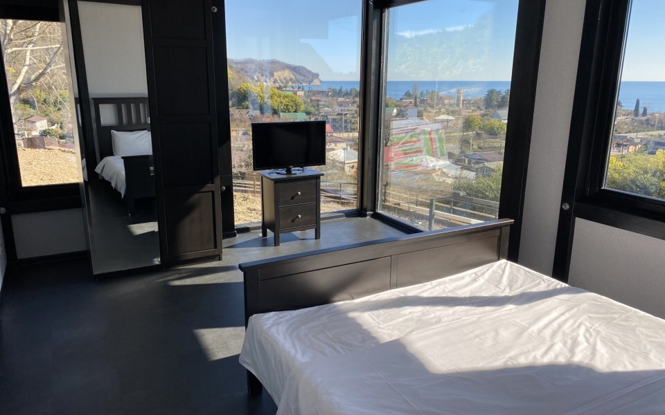 2 комфортные небольшие комнаты и гостинная-столовая зона с кухонным уголком. Панорамные окна на всю гостинную с таким же большим балконом и видом на море.