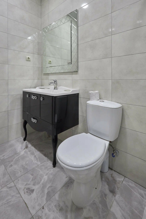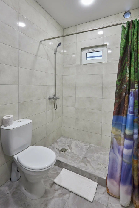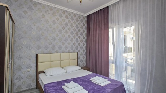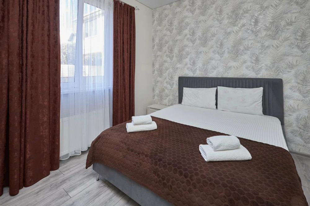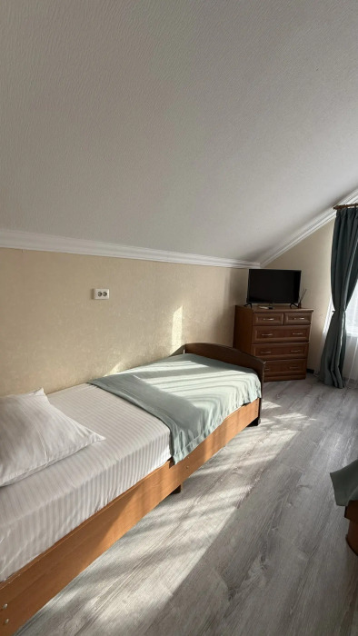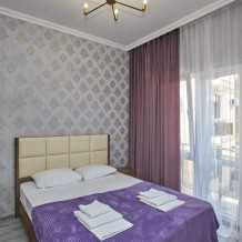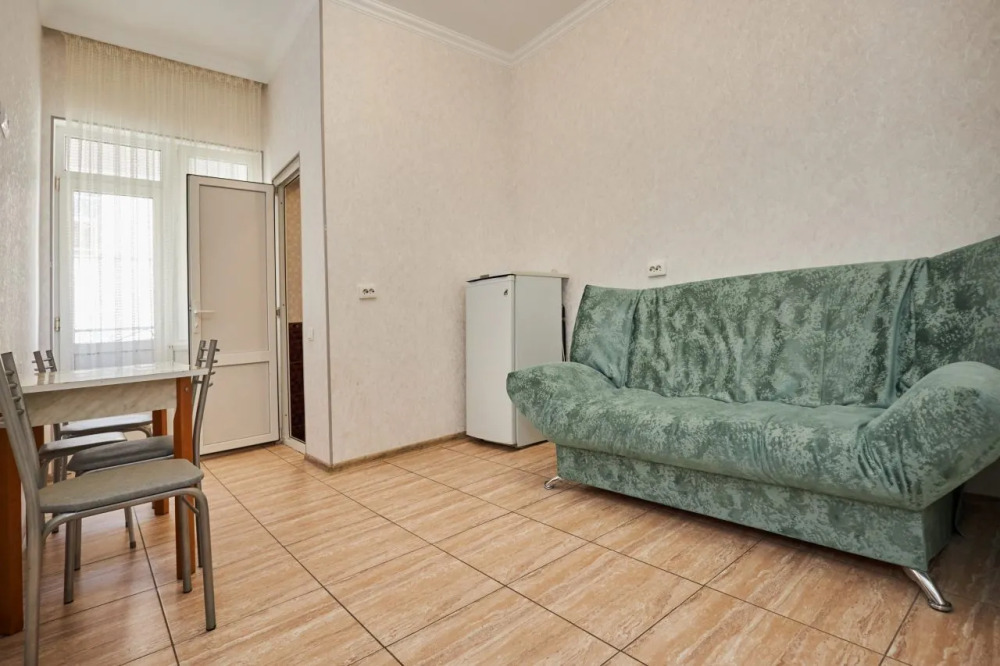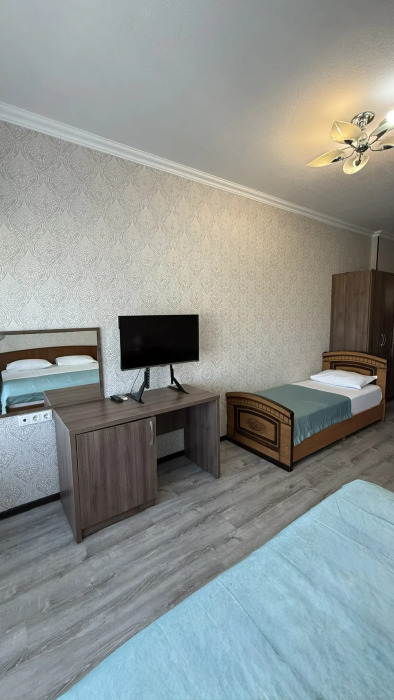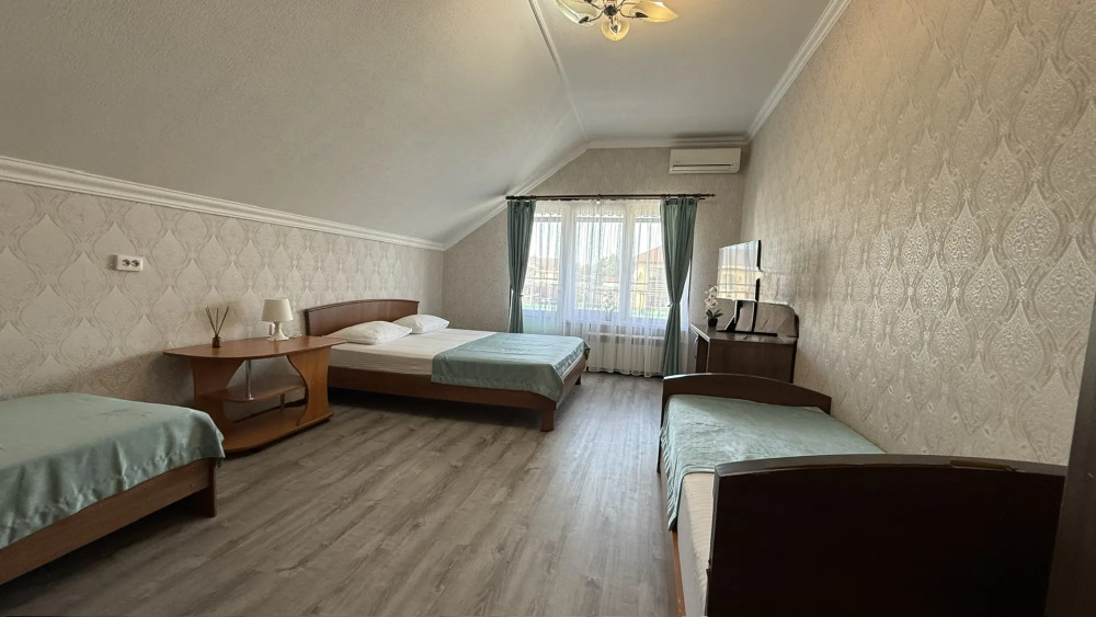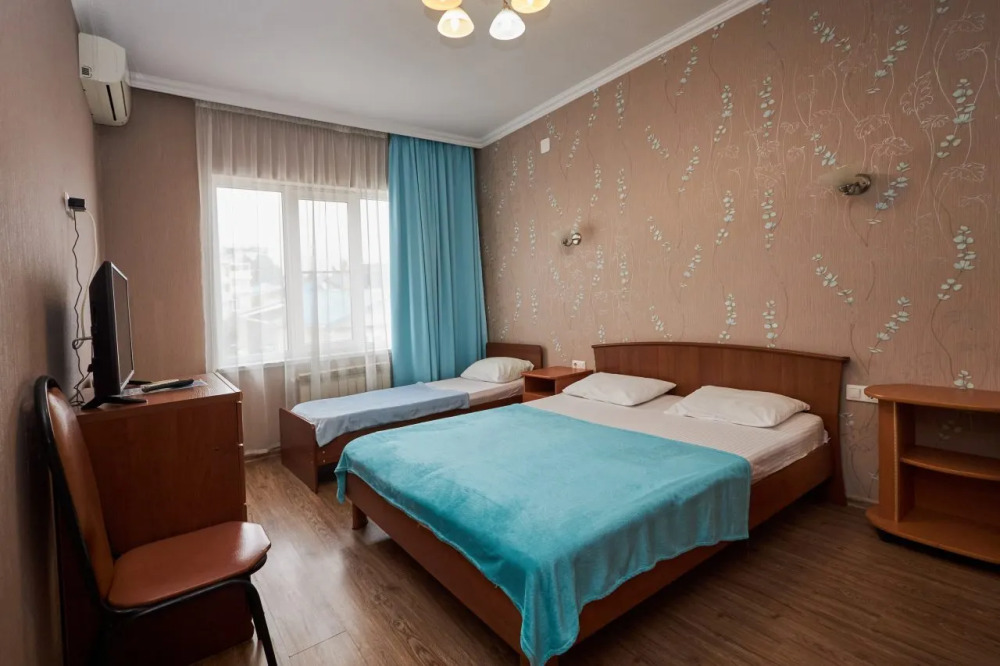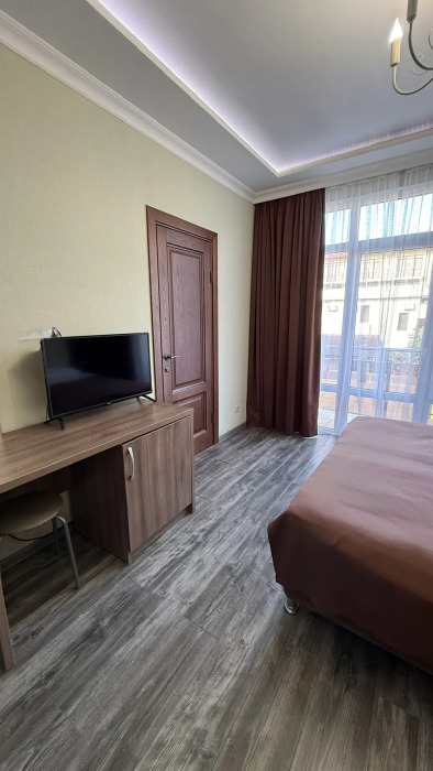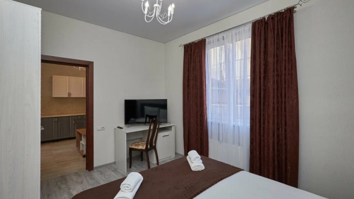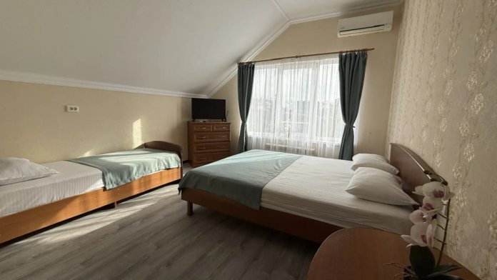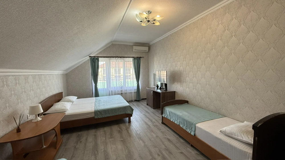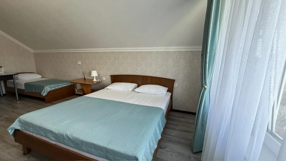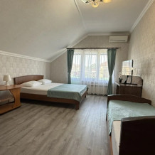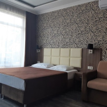 Светлый, уютный номер меблирован шкафом для одежды, тумбочками, кухонным столом, стульями. Для гостей имеется плазменный телевизор и кондиционер. Так же для удобства гостей имеется кухня с холодильником, электроплитой, чайником, необходимым набором посуды. Собственная ванная комната оснащена душем и туалетными принадлежностями.
