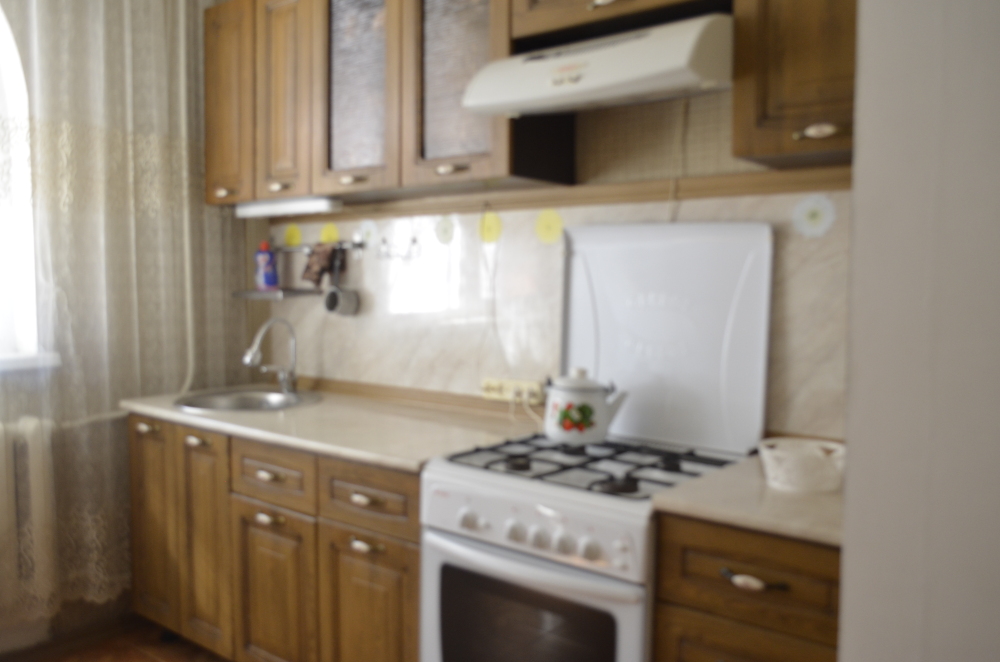 Просторная кухня: холодильник, СВЧ, газовая плита. Есть посуда для приготовления пищи и сервировки стола.